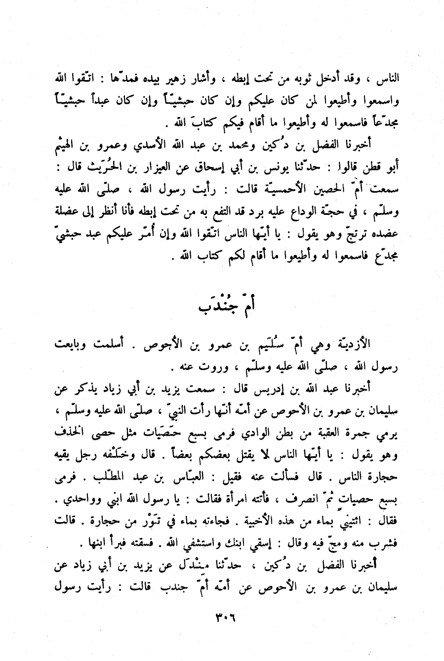 §أُمُّ جُنْدُبٍ الْأَزْدِيَّةُ وَهِيَ أُمُّ سُلَيْمَانَ بْنِ عَمْرِو بْنِ الْأَحْوَصِ، أَسْلَمَتْ وَبَايَعَتْ رَسُولَ اللَّهِ صلّى الله عليه وسلم وَرَوَتْ عَنْهُ