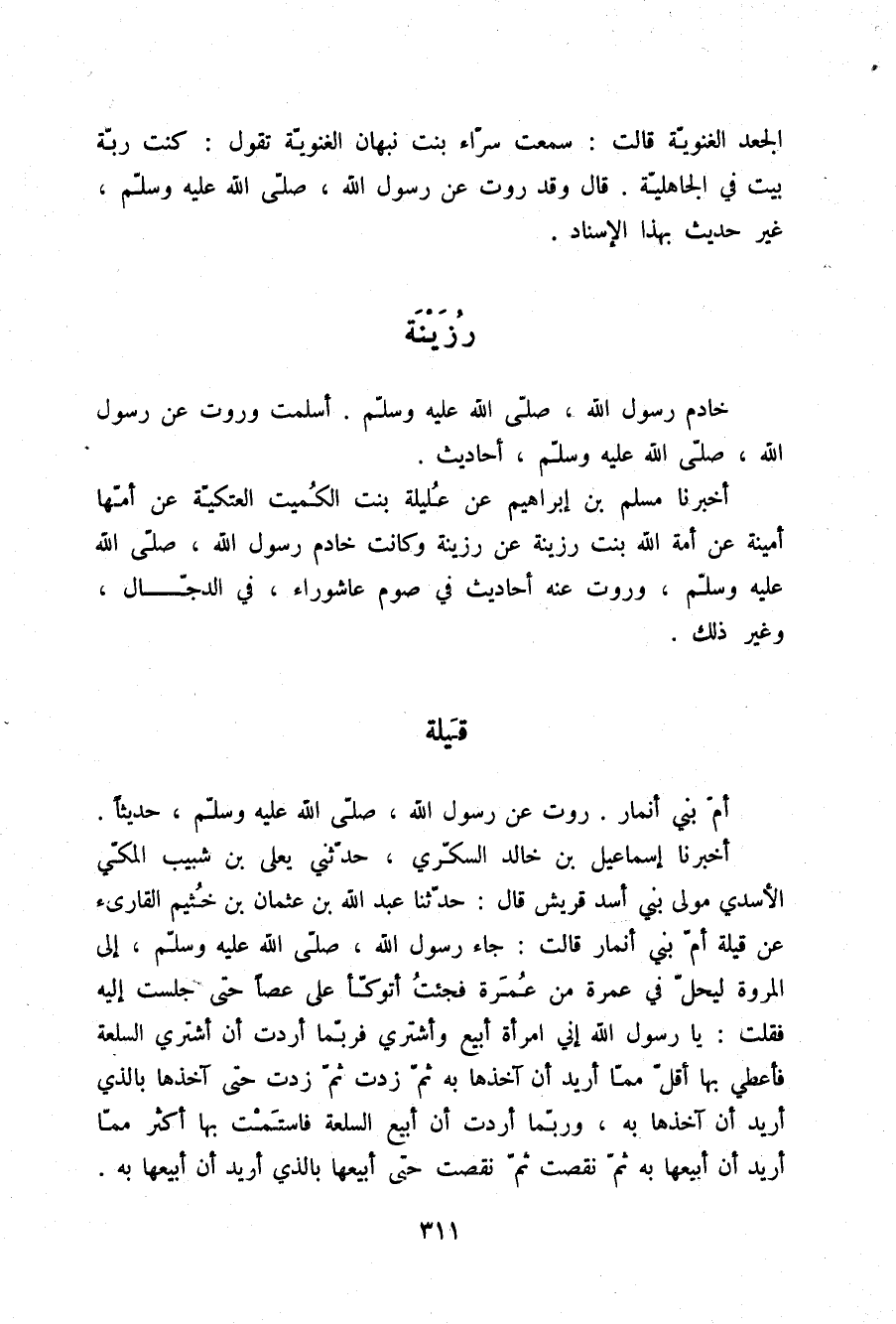 §رُزَيْنَةُ خَادِمُ رَسُولِ اللَّهِ صلّى الله عليه وسلم أَسْلَمَتْ وَرَوَتْ عَنْ رَسُولِ اللَّهِ صلّى الله عليه وسلم أَحَادِيثَ. أَخْبَرَنَا مُسْلِمُ بْنُ إِبْرَاهِيمَ عَنْ عَلِيلَةَ بِنْتِ الْكُمَيْتِ الْعَتَكِيَّةِ , عَنْ أُمِّهَا أَمِينَةَ عَنْ أَمَةِ اللَّهِ بِنْتِ رُزَيْنَةَ، عَنْ رُزَيْنَةَ، وَكَانَتْ خَادِمَ رَسُولِ اللَّهِ صلّى الله عليه وسلم وَرَوَتْ عَنْهُ أَحَادِيثَ فِي صَوْمِ عَاشُورَاءَ وَفِي الدَّجَّالِ وَغَيْرِ ذَلِكَ