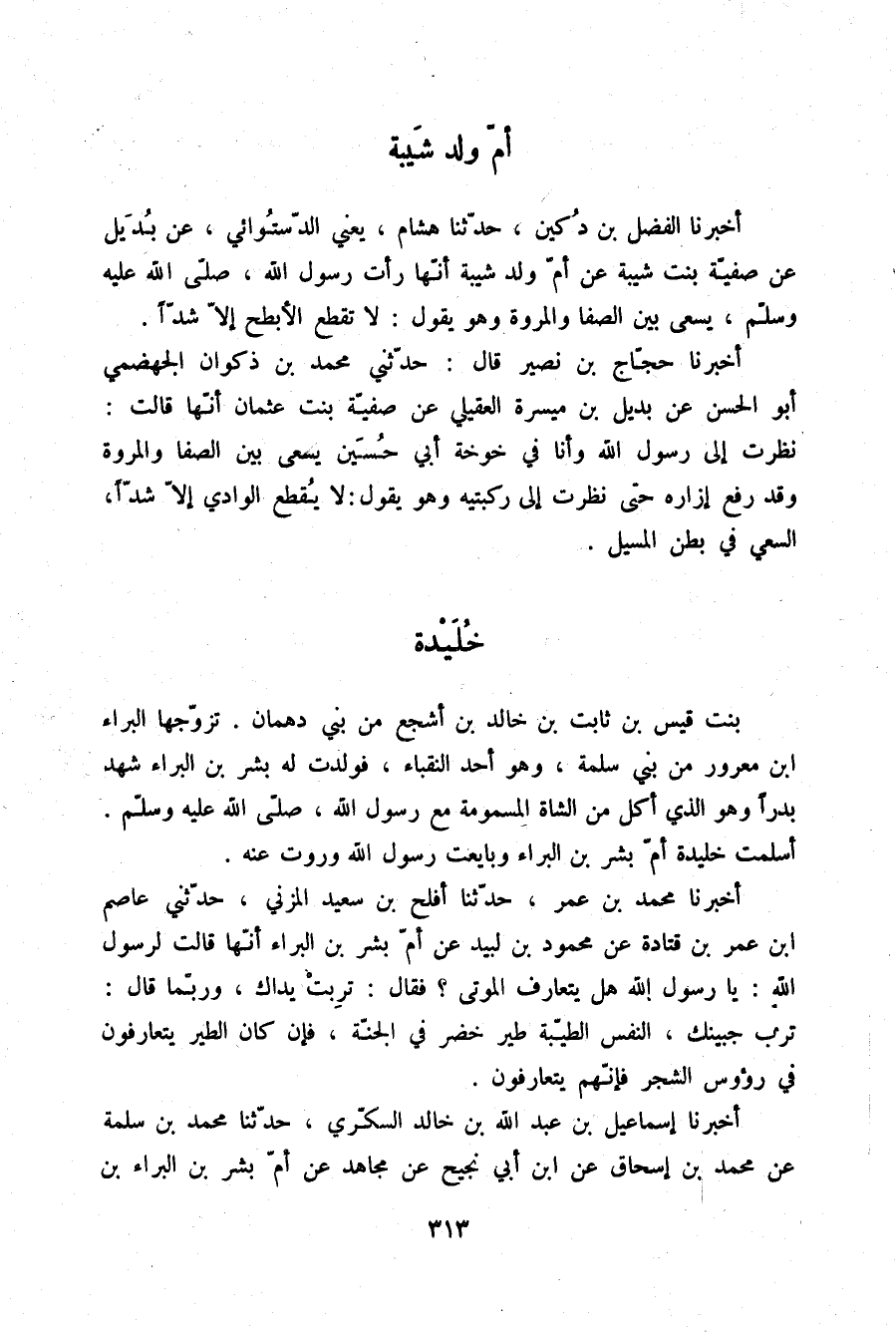 أَخْبَرَنَا الْفَضْلُ بْنُ دُكَيْنٍ، حَدَّثَنَا هِشَامٌ يَعْنِي الدَّسْتُوَائِيَّ، عَنْ بُدَيْلٍ، عَنْ صَفِيَّةَ بِنْتِ شَيْبَةَ، عَنْ أُمِّ وَلَدِ شَيْبَةَ أَنَّهَا رَأَتْ رَسُولَ اللَّهِ صلّى الله عليه وسلم يَسْعَى بَيْنَ الصَّفَا وَالْمَرْوَةِ وَهُوَ يَقُولُ: «§لَا تُقْطَعُ الْأَبْطَحُ إِلَّا شَدًّا» .