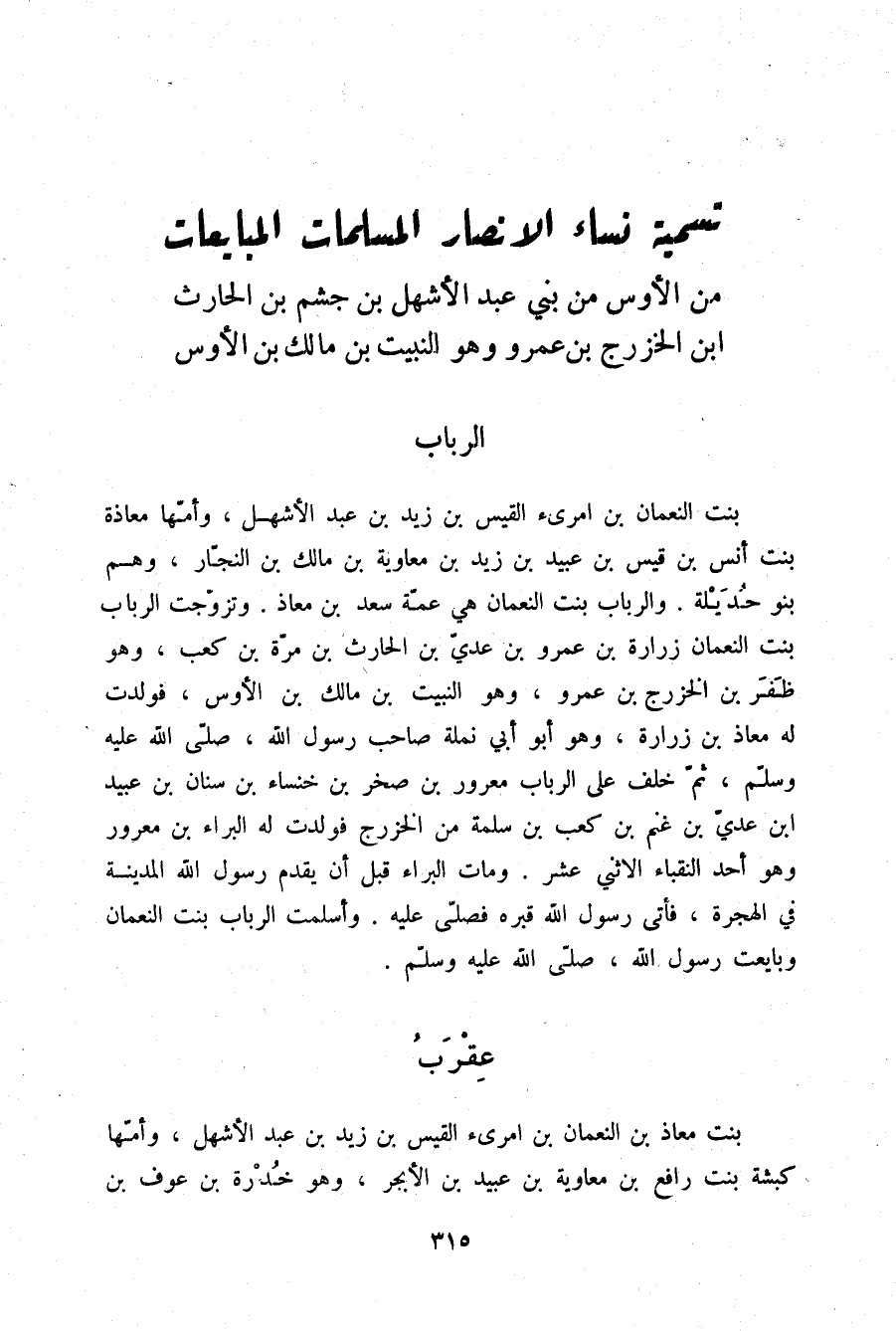 §الرَّبَابُ بِنْتُ النُّعْمَانِ بْنِ امْرِئِ الْقَيْسِ بْنِ زَيْدِ بْنِ عَبْدِ الْأَشْهَلِ وَأُمُّهَا مُعَاذَةُ بِنْتُ أَنَسِ بْنِ قَيْسِ بْنِ عُبَيْدِ بْنِ زَيْدِ بْنِ مُعَاوِيَةَ بْنِ مَالِكِ بْنِ النَّجَّارِ وَهُمْ بَنُو حُدَيْلَةَ، وَالرَّبَابُ بِنْتُ النُّعْمَانِ هِيَ عَمَّةُ سَعْدِ بْنِ مُعَاذٍ وَتَزَوَّجَتِ الرَّبَابُ بِنْتُ النُّعْمَانِ زُرَارَةَ بْنَ عَمْرِو بْنِ عَدِيِّ بْنِ الْحَارِثِ بْنِ مُرَّةَ بْنِ كَعْبٍ وَهُوَ ظُفُرُ بْنُ الْخَزْرَجِ بْنِ عَمْرٍو وَهُوَ النَّبِيتُ بْنُ مَالِكِ بْنِ الْأَوْسِ , فَوَلَدَتْ لَهُ مُعَاذَ بْنَ زُرَارَةَ وَهُوَ أَبُو أَبِي نَمْلَةَ صَاحِبِ رَسُولِ اللَّهِ صلّى الله عليه وسلم ثُمَّ خَلَفَ عَلَى الرَّبَابِ مَعْرُورُ بْنُ صَخْرِ بْنِ خَنْسَاءَ بْنِ سِنَانِ بْنِ عُبَيْدِ بْنِ عَدِيِّ بْنِ غَنْمِ بْنِ كَعْبِ بْنِ سَلَمَةَ مِنْ الْخَزْرَجِ فَوَلَدَتْ لَهُ الْبَرَاءَ بْنَ مَعْرُورٍ وَهُوَ أَحَدُ النُّقَبَاءِ الْاثْنَيْ عَشَرَ وَمَاتَ الْبَرَاءُ قَبْلَ أَنْ يَقْدَمَ رَسُولُ اللَّهِ الْمَدِينَةَ فِي الْهِجْرَةِ. فَأَتَى رَسُولُ اللَّهِ قَبْرَهُ فَصَلَّى عَلَيْهِ. وَأَسْلَمَتِ الرَّبَابُ بِنْتُ النُّعْمَانِ وَبَايَعَتْ رَسُولَ اللَّهِ صلّى الله عليه وسلم