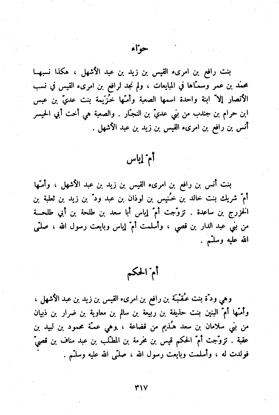 §حَوَّاءُ بِنْتُ رَافِعِ بْنِ امْرِئِ الْقَيْسِ بْنِ زَيْدِ بْنِ عَبْدِ الْأَشْهَلِ هَكَذَا نَسَبَهَا مُحَمَّدُ بْنُ عُمَرَ وَسَمَّاهَا فِي الْمُبَايِعَاتِ وَلَمْ نَجِدْ لِرَافِعِ بْنِ امْرِئِ الْقَيْسِ فِي نَسَبِ الْأَنْصَارِ إِلَّا ابْنَةً وَاحِدَةً اسْمُهَا الصَّعْبَةُ وَأُمُّهَا خُزَيْمَةُ بِنْتُ عَدِيِّ بْنِ عَبْسِ بْنِ حَرَامِ بْنِ جُنْدُبٍ مِنْ بَنِي عَدِيِّ بْنِ النَّجَّارِ وَالصَّعْبَةُ هِيَ أُخْتُ أَبِي الْحَيْسَرِ أَنَسِ بْنِ رَافِعِ بْنِ امْرِئِ الْقَيْسِ بْنِ زَيْدِ بْنِ عَبْدِ الْأَشْهَلِ.