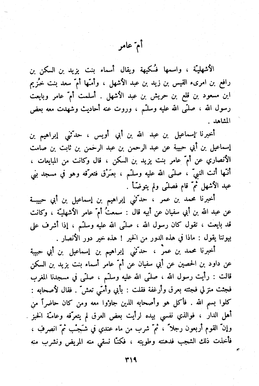 §أُمُّ عَامِرٍ الْأَشْهَلِيَّةُ وَاسْمُهَا فُكَيْهَةُ وَيُقَالُ أَسْمَاءُ بِنْتُ يَزِيدَ بْنِ السَّكَنِ بْنِ رَافِعِ بْنِ امْرِئِ الْقَيْسِ بْنِ زَيْدِ بْنِ عَبْدِ الْأَشْهَلِ وَأُمُّهَا أُمُّ سَعْدِ بِنْتُ خُزَيْمِ بْنِ مَسْعُودِ بْنِ قَلْعِ بْنِ حَرِيشِ بْنِ عَبْدِ الْأَشْهَلِ أَسْلَمَتْ أُمُّ عَامِرٍ وَبَايَعَتْ رَسُولَ اللَّهِ صلّى الله عليه وسلم وَرَوَتْ عَنْهُ أَحَادِيثَ وَشَهِدَتْ مَعَهُ بَعْضَ الْمَشَاهِدِ.
