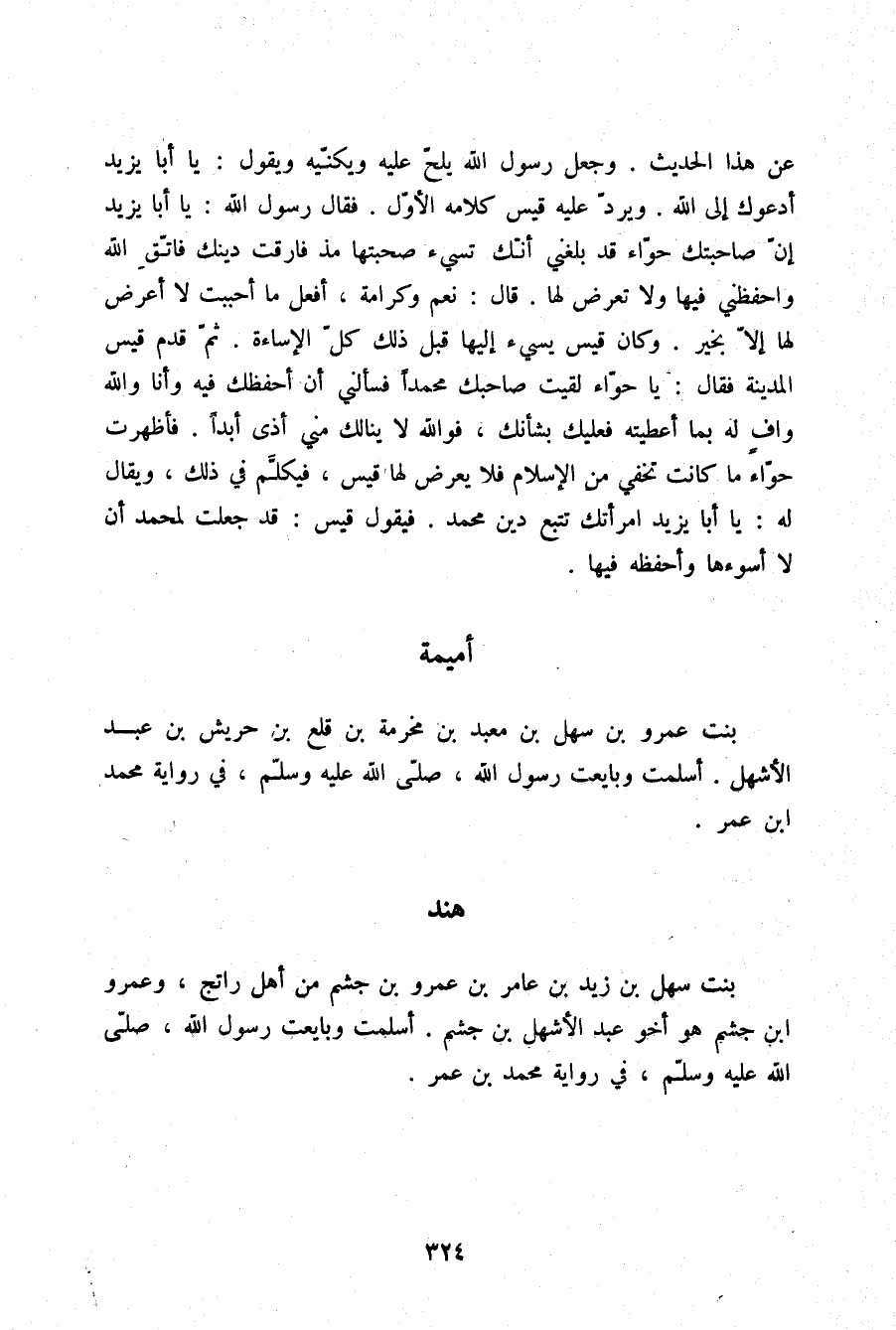 عَنْ هَذَا الْحَدِيثِ , وَجَعَلَ رَسُولُ اللَّهِ يُلِحُّ عَلَيْهِ وَيُكَنِّيهِ وَيَقُولُ: «يَا أَبَا يَزِيدَ أَدْعُوكَ إِلَى اللَّهِ» وَيَرُدُّ عَلَيْهِ قَيْسٌ كَلَامَهُ الْأَوَّلَ، فَقَالَ رَسُولُ اللَّهِ: «يَا أَبَا يَزِيدَ إِنَّ صَاحِبَتَكَ حَوَّاءَ قَدْ بَلَغَنِي أَنَّكَ تُسِيءُ صُحْبَتَهَا مُذْ فَارَقَتْ دِينَكَ فَاتَّقِ اللَّهَ وَاحْفَظْنِي فِيهَا وَلَا تَعَرَّضْ لَهَا» ، قَالَ: نَعَمْ وَكَرَامَةً أَفْعَلُ مَا أَحْبَبْتَ لَا أَعْرِضُ لَهَا إِلَّا بِخَيْرٍ، وَكَانَ قَيْسٌ يُسِيءُ إِلَيْهَا قَبْلَ ذَلِكَ كُلَّ الْإِسَاءَةِ ثُمَّ قَدِمَ قَيْسٌ الْمَدِينَةَ، فَقَالَ: يَا حَوَّاءُ لَقِيتُ صَاحِبَكِ مُحَمَّدًا فَسَأَلَنِي أَنْ أَحْفَظَكِ فِيهِ وَأَنَا وَاللَّهِ وَافٍ لَهُ بِمَا أَعْطَيْتُهُ فَعَلَيْكِ بِشَأْنِكِ فَوَاللَّهِ لَا يَنَالُكِ مِنِّي أَذًى أَبَدًا. فَأَظْهَرَتْ حَوَّاءُ مَا كَانَتْ تُخْفِي مِنَ الْإِسْلَامِ فَلَا يَعْرِضُ لَهَا قَيْسٌ، فَيُكَلَّمُ فِي ذَلِكَ وَيُقَالُ لَهُ يَا أَبَا يَزِيدَ امْرَأَتُكَ تَتَّبِعُ دِينَ مُحَمَّدٍ فَيَقُولُ قَيْسٌ: قَدْ جَعَلْتُ لِمُحَمَّدٍ أَنْ لَا أَسُوءَهَا وَأَحْفَظَهُ فِيهَا.