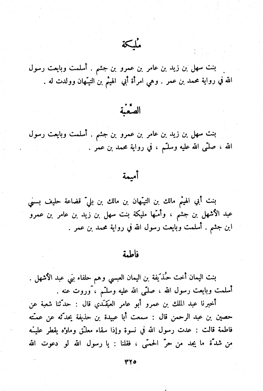 §الصَّعْبَةَ بِنْتَ سَهْلِ بْنِ زَيْدِ بْنِ عَامِرِ بْنِ عَمْرِو بْنِ جُشَمٍ، أَسْلَمَتْ وَبَايَعَتْ رَسُولَ اللَّهِ صلّى الله عليه وسلم فِي رِوَايَةِ مُحَمَّدِ بْنِ عُمَرَ