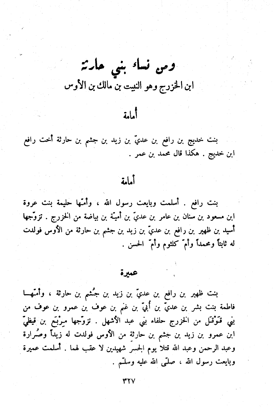 §أُمَامَةُ بِنْتُ رَافِعٍ أَسْلَمَتْ وَبَايَعَتْ رَسُولَ اللَّهِ وَأُمُّهَا حَلِيمَةُ بِنْتُ عُرْوَةَ بْنِ مَسْعُودِ بْنِ سِنَانِ بْنِ عَامِرِ بْنِ عَدِيِّ بْنِ أُمَيَّةَ بْنِ بَيَاضَةَ مِنَ الْخَزْرَجِ تَزَوَّجَهَا أُسَيْدُ بْنُ ظُهَيْرِ بْنِ رَافِعِ بْنِ عَدِيِّ بْنِ زَيْدِ بْنِ جُشَمِ بْنِ حَارِثَةَ مِنَ الْأَوْسِ فَوَلَدَتْ لَهُ ثَابِتًا وَمُحَمَّدًا وَأُمَّ كُلْثُومٍ وَأُمَّ الْحَسَنِ.