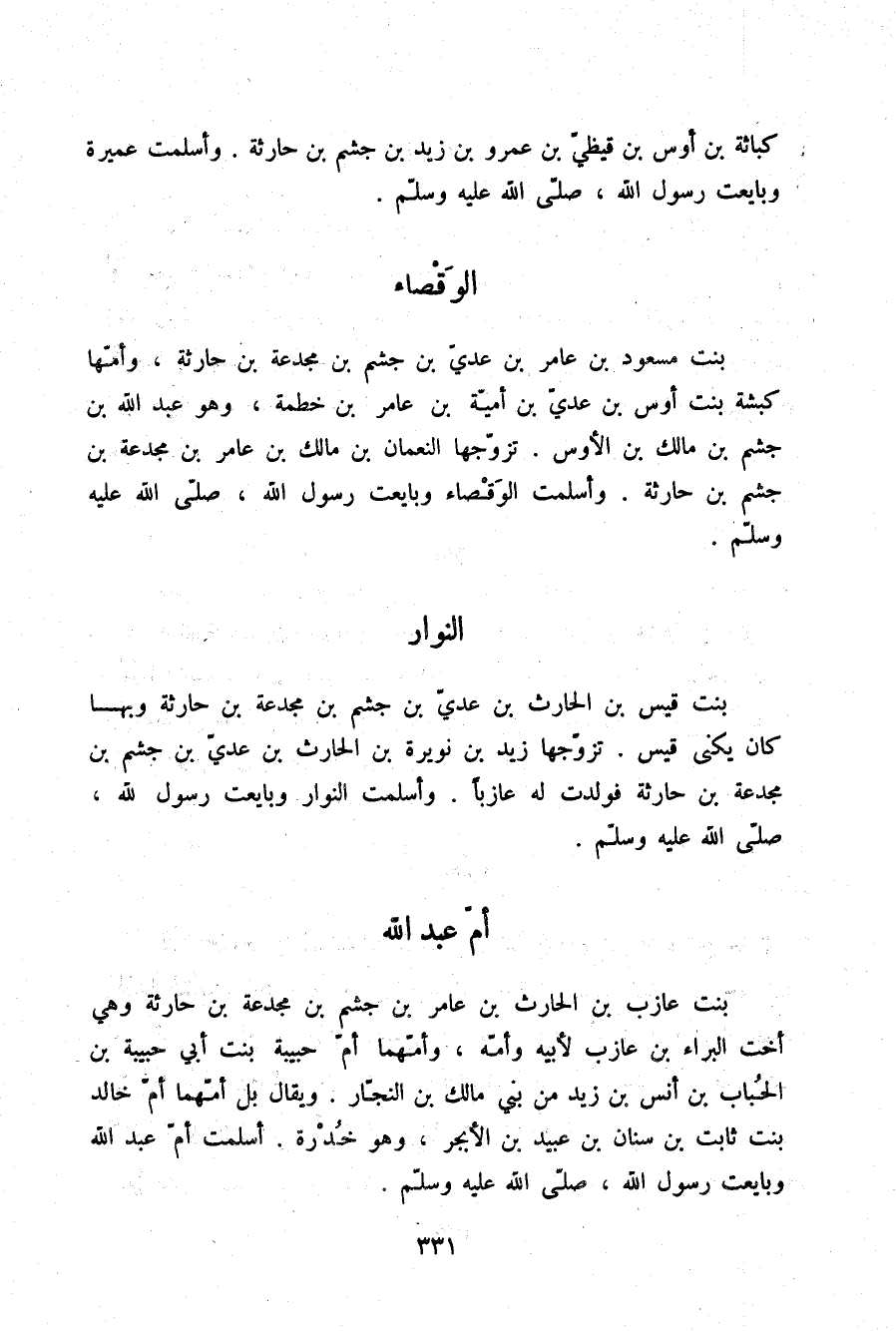 §الْوَقْصَاءُ بِنْتُ مَسْعُودِ بْنِ عَامِرِ بْنِ عَدِيِّ بْنِ جُشَمِ بْنِ مَجْدَعَةَ بْنِ حَارِثَةَ وَأُمُّهَا كَبْشَةُ بِنْتُ أَوْسِ بْنِ عَدِيِّ بْنِ أُمَيَّةَ بْنِ عَامِرِ بْنِ خَطْمَةَ وَهُوَ عَبْدُ اللَّهِ بْنُ جُشَمِ بْنِ مَالِكِ بْنِ الْأَوْسِ تَزَوَّجَهَا النُّعْمَانُ بْنُ مَالِكِ بْنِ عَامِرِ بْنِ مَجْدَعَةَ بْنِ جُشَمِ بْنِ حَارِثَةَ وَأَسْلَمَتِ الْوَقْصَاءُ وَبَايَعَتْ رَسُولَ اللَّهِ صلّى الله عليه وسلم.
