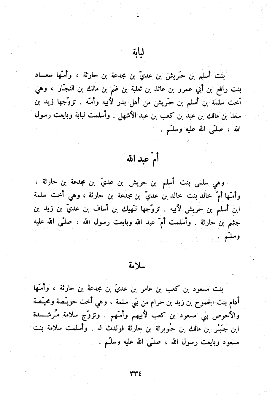 §لُبَابَةُ بِنْتُ أَسْلَمَ بْنِ حَرِيشِ بْنِ عَدِيِّ بْنِ مَجْدَعَةَ بْنِ حَارِثَةَ وَأُمُّهَا سُعَادُ بِنْتُ رَافِعِ بْنِ أَبِي عَمْرِو بْنِ عَائِذِ بْنِ ثَعْلَبَةَ بْنِ غَنْمِ بْنِ مَالِكِ بْنِ النَّجَّارِ وَهِيَ أُخْتُ سَلَمَةَ بْنِ أَسْلَمَ بْنِ حَرِيشٍ مِنْ أَهْلِ بَدْرٍ لِأَبِيهِ وَأُمِّهِ تَزَوَّجَهَا زَيْدُ بْنُ سَعْدِ بْنِ مَالِكِ بْنِ عَبْدِ بْنِ كَعْبِ بْنِ عَبْدِ الْأَشْهَلِ وَأَسْلَمَتْ لُبَابَةُ وَبَايَعَتْ رَسُولَ اللَّهِ صلّى الله عليه وسلم