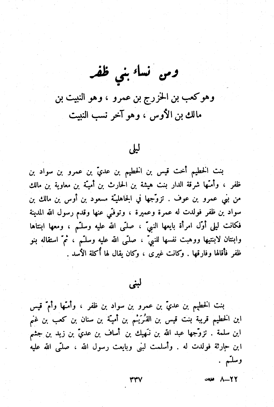 §وَمِنْ نِسَاءِ بَنِي ظُفُرَ وَهُوَ كَعْبُ بْنُ الْخَزْرَجِ بْنِ عَمْرٍو وَهُوَ النَّبِيتُ بْنُ مَالِكِ بْنِ الْأَوْسِ وَهُوَ آخِرُ نَسَبِ النَّبِيتِ