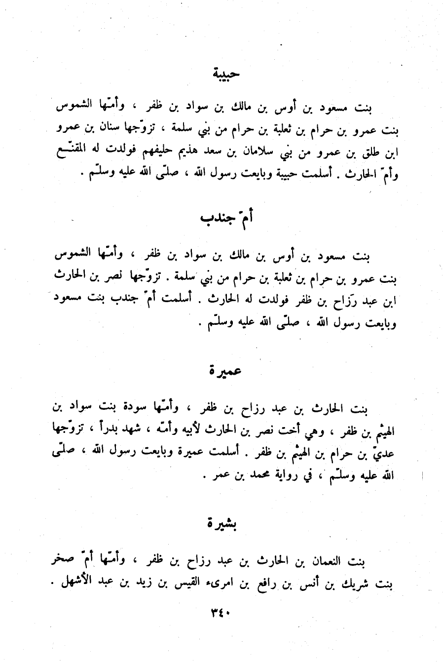 §حَبِيبَةُ بِنْتُ مَسْعُودِ بْنِ أَوْسِ بْنِ مَالِكِ بْنِ سَوَّادِ بْنِ ظُفُرَ وَأُمُّهَا الشَّمُوسُ بِنْتُ عَمْرِو بْنِ حَرَامِ بْنِ ثَعْلَبَةَ بْنِ حَرَامٍ مِنْ بَنِي سَلِمَةَ تَزَوَّجَهَا سِنَانُ بْنُ عَمْرِو بْنِ طَلْقِ بْنِ عَمْرٍو مِنْ بَنِي سَلَامَانَ بْنِ سَعْدِ هُذَيْمٍ حَلِيفِهِمْ فَوَلَدَتْ لَهُ الْمُقَنَّعَ وَأُمَّ الْحَارِثِ أَسْلَمَتْ حَبِيبَةُ وَبَايَعَتْ رَسُولَ اللَّهِ صلّى الله عليه وسلم.