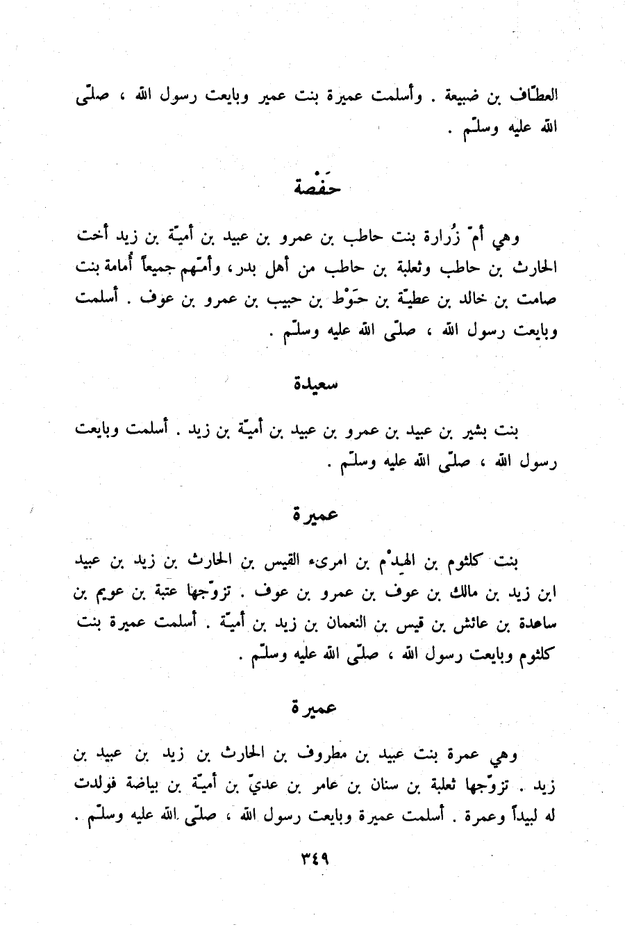 §سَعِيدَةُ بِنْتُ بَشِيرِ بْنِ عُبَيْدِ بْنِ عَمْرِو بْنِ عُبَيْدِ بْنِ أُمَيَّةَ بْنِ زَيْدٍ أَسْلَمَتْ وَبَايَعَتْ رَسُولَ اللَّهِ صلّى الله عليه وسلم