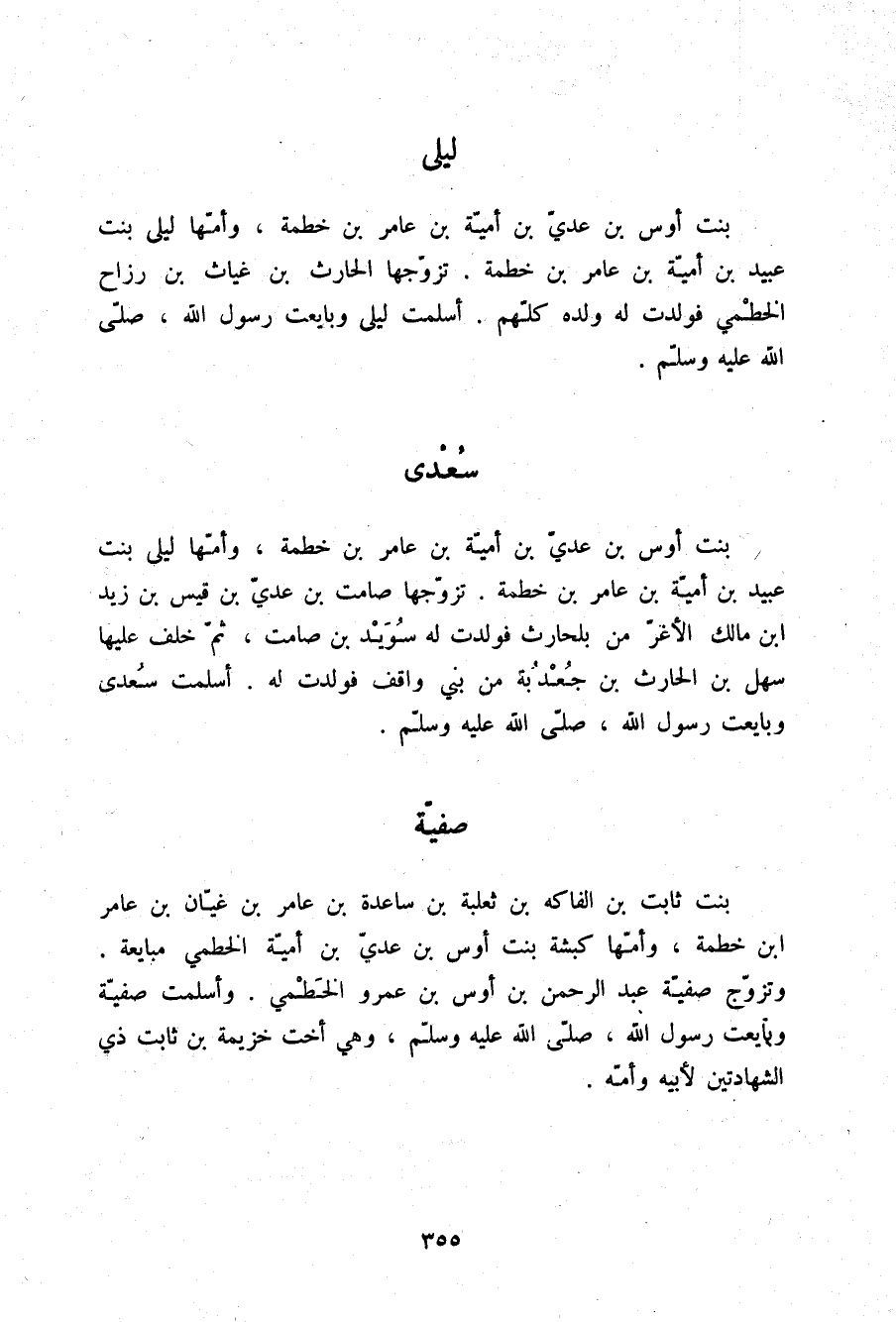 §لَيْلَى بِنْتُ أَوْسِ بْنِ عَدِيِّ بْنِ أُمَيَّةَ بْنِ عَامِرِ بْنِ خَطْمَةَ وَأُمُّهَا لَيْلَى بِنْتُ عُبَيْدِ بْنِ أُمَيَّةَ بْنِ عَامِرِ بْنِ خَطْمَةَ تَزَوَّجَهَا الْحَارِثُ بْنُ غِيَاثِ بْنِ رَزَاحٍ الْخَطْمِيُّ فَوَلَدَتْ لَهُ وَلَدَهُ كُلَّهُمْ أَسْلَمَتْ لَيْلَى وَبَايَعَتْ رَسُولَ اللَّهِ صلّى الله عليه وسلم.