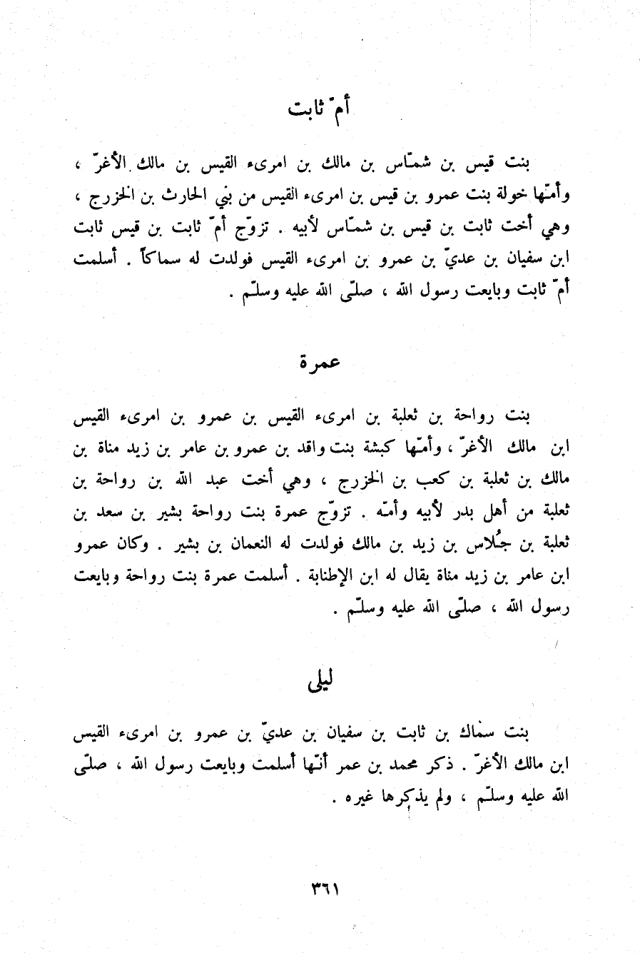 §عَمْرَةُ بِنْتُ رَوَاحَةَ بْنَ ثَعْلَبَةَ بْنِ امْرِئِ الْقَيْسِ بْنِ عَمْرِو بْنِ امْرِئِ الْقَيْسِ بْنِ مَالِكٍ الْأَغَرِّ وَأُمُّهَا كَبْشَةُ بِنْتُ وَاقِدِ بْنِ عَمْرِو بْنِ عَامِرِ بْنِ زَيْدِ مَنَاةَ بْنِ مَالِكِ بْنِ ثَعْلَبَةَ بْنِ كَعْبِ بْنِ الْخَزْرَجِ وَهِيَ أُخْتُ عَبْدِ اللَّهِ بْنِ رَوَاحَةَ بْنِ ثَعْلَبَةَ مِنْ أَهْلِ بَدْرٍ لِأَبِيهِ وَأُمِّهِ تَزَوَّجَ عَمْرَةَ بِنْتَ رَوَاحَةَ بَشِيرُ بْنُ سَعْدِ بْنِ ثَعْلَبَةَ بْنِ جُلَاسِ بْنِ زَيْدِ بْنِ مَالِكٍ فَوَلَدَتْ لَهُ النُّعْمَانَ بْنَ بَشِيرٍ وَكَانَ عَمْرُو بْنُ عَامِرِ بْنِ زَيْدِ مَنَاةَ يُقَالُ لَهُ: ابْنُ الْإِطْنَابَةِ أَسْلَمَتْ عَمْرَةُ بِنْتُ رَوَاحَةَ وَبَايَعَتْ رَسُولَ اللَّهِ صلّى الله عليه وسلم.