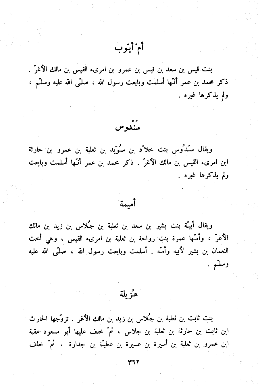 §أُمُّ أَيُّوبَ بِنْتُ قَيْسِ بْنِ سَعْدِ بْنِ قَيْسِ بْنِ عَمْرِو بْنِ امْرِئِ الْقَيْسِ بْنِ مَالِكٍ الْأَغَرِّ ذَكَرَ مُحَمَّدُ بْنُ عُمَرَ أَنَّهَا أَسْلَمَتْ وَبَايَعَتْ رَسُولَ اللَّهِ صلّى الله عليه وسلم وَلَمْ يَذْكُرْهَا غَيْرُهُ.