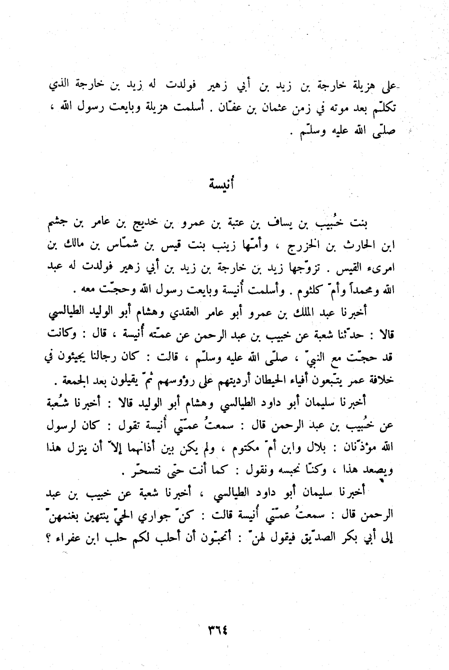 أَخْبَرَنَا سُلَيْمَانُ أَبُو دَاوُدَ الطَّيَالِسِيُّ، أَخْبَرَنَا شُعْبَةُ، عَنْ خُبَيْبِ بْنِ عَبْدِ الرَّحْمَنِ قَالَ: سَمِعْتُ عَمَّتِيَ أُنَيْسَةَ قَالَتْ: " §كُنَّ جَوَارِي الْحَيِّ يَنْتَهِينَ بِغَنَمِهِنَّ إِلَى أَبِي بَكْرٍ الصّديقِ فَيَقُولُ لَهُنَّ: أَتُحِبُّونَ أَنْ أَحْلُبَ لَكُمْ حَلْبَ ابْنِ عَفْرَاءَ؟ "