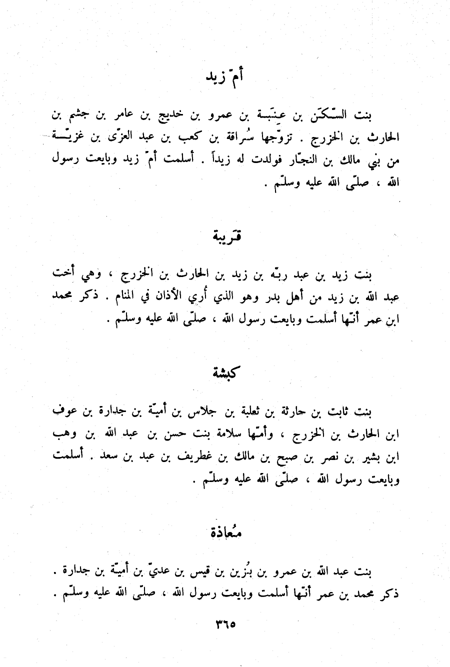 §أُمُّ زَيْدٍ بِنْتُ السَّكَنِ بْنِ عِنَبَةَ بْنِ عَمْرِو بْنِ خَدِيجِ بْنِ عَامِرِ بْنِ جُشَمِ بْنِ الْحَارِثِ بْنِ الْخَزْرَجِ تَزَوَّجَهَا سُرَاقَةُ بْنُ كَعْبِ بْنِ عَبْدِ الْعُزَّى بْنِ غَزِيَّةَ مِنْ بَنِي مَالِكِ بْنِ النَّجَّارِ فَوَلَدَتْ لَهُ زَيْدًا أَسْلَمَتْ أُمُّ زَيْدٍ وَبَايَعَتْ رَسُولَ اللَّهِ صلّى الله عليه وسلم