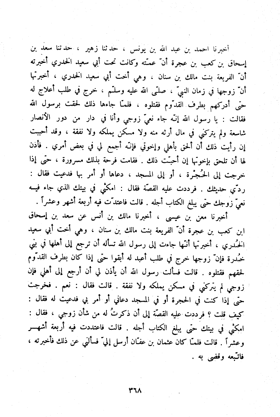 أَخْبَرَنَا أَحْمَدُ بْنُ عَبْدِ اللَّهِ بْنِ يُونُسَ، حَدَّثَنَا زُهَيْرٌ، حَدَّثَنَا سَعْدُ بْنُ إِسْحَاقَ بْنِ كَعْبِ بْنِ عُجْرَةَ، أَنَّ عَمَّتَهُ وَكَانَتْ تَحْتَ أَبِي سَعِيدٍ الْخُدْرِيِّ أَخْبَرَتْهُ أَنَّ الْفُرَيْعَةَ بِنْتَ مَالِكِ بْنِ سِنَانٍ وَهِيَ أُخْتُ أَبِي سَعِيدٍ الْخُدْرِيِّ أَخْبَرَتْهَا أَنَّ زَوْجَهَا فِي زَمَانِ النَّبِيِّ صلّى الله عليه وسلم خَرَجَ فِي طَلَبِ أَعْلَاجٍ لَهُ حَتَّى أَدْرَكَهُمْ بِطَرَفِ الْقُدُومِ فَقَتَلُوهُ فَلَمَّا جَاءَهَا ذَلِكَ لَحِقَتْ بِرَسُولِ اللَّهِ فَقَالَتْ: يَا رَسُولَ اللَّهِ إِنَّهُ جَاءَ نَعْيُ زَوْجِي وَأَنَا فِي دَارٍ مِنْ دُورِ الْأَنْصَارِ شَاسِعَةٍ وَلَمْ يَتْرُكْنِي فِي مَالٍ أَرِثُهُ مِنْهُ وَلَا مَسْكَنٍ يَمْلِكُهُ وَلَا نَفَقَةٍ وَقَدْ أَحْبَبْتُ إِنْ رَأَيْتُ ذَلِكَ أَنْ أَلْحَقَ بِأَهْلِي وَإِخْوَتِي فَإِنَّهُ أَجْمَعُ لِي فِي بَعْضِ أَمْرِي فَأَذِنَ لَهَا أَنْ تَلْحَقَ بِإِخْوَتِهَا إِنْ أَحَبَّتْ ذَلِكَ فَقَامَتْ فَرِحَةً بِذَلِكَ مَسْرُورَةً حَتَّى إِذَا خَرَجَتْ إِلَى الْحُجْرَةِ أَوْ إِلَى الْمَسْجِدِ دَعَاهَا أَوْ أَمَرَ بِهَا فَدُعِيَتْ، فَقَالَ: «§رُدِّي حَدِيثَكِ» فَرَدَدْتُ عَلَيْهِ الْقِصَّةَ، فَقَالَ: «امْكُثِي فِي بَيْتِكِ الَّذِي جَاءَ فِيهِ نَعْيُ زَوْجِكِ حَتَّى يَبْلُغَ الْكِتَابُ أَجَلَهُ» .، قَالَتْ: فَاعْتَدَّتْ فِيهِ أَرْبَعَةَ أَشْهُرٍ وَعَشْرًا.