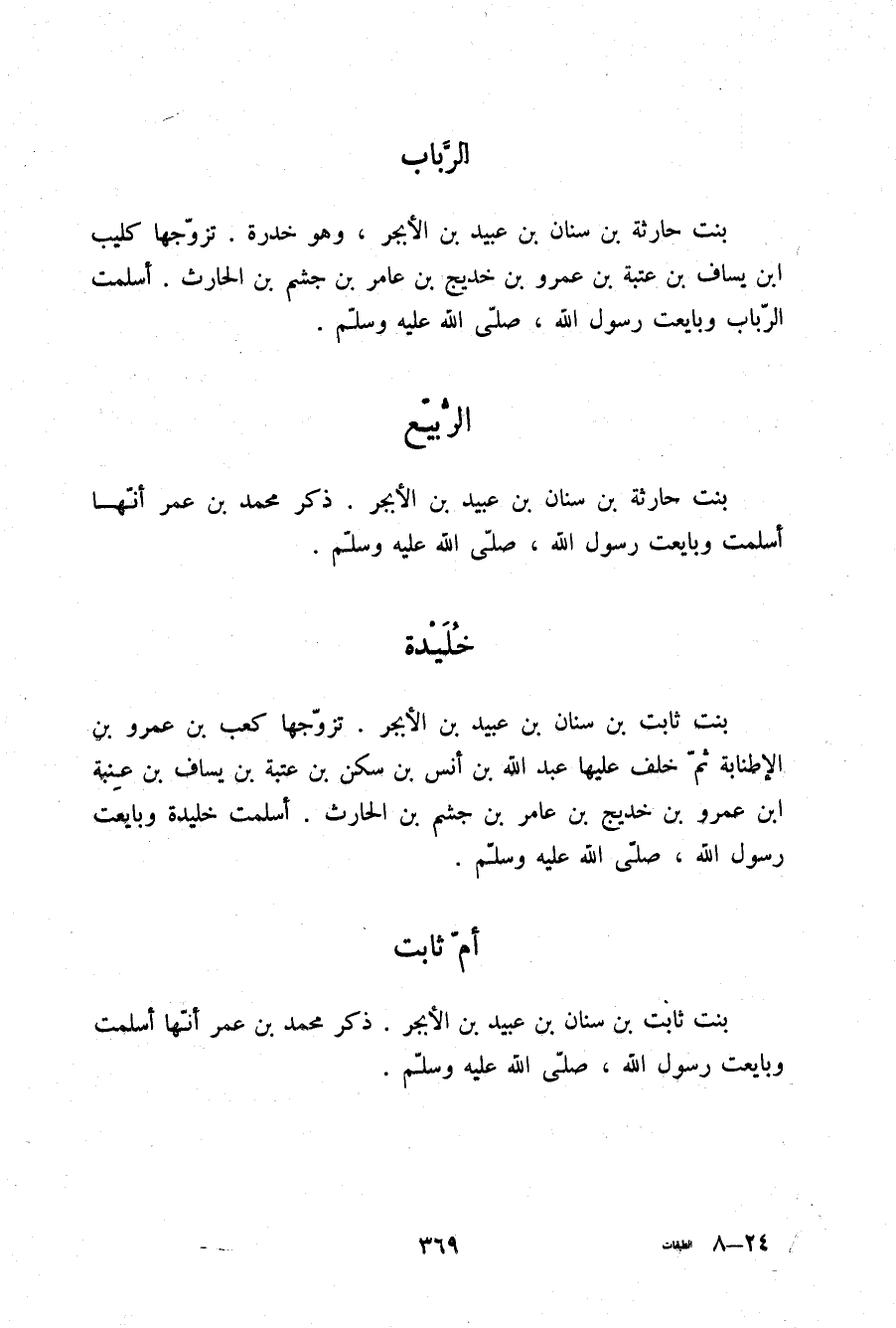 §الرَّبَابُ بِنْتُ حَارِثَةَ بْنِ سِنَانِ بْنِ عُبَيْدِ بْنِ الْأَبْجَرِ وَهُوَ خُدْرَةُ تَزَوَّجَهَا كُلَيْبُ بْنُ يَسَافِ بْنِ عِنَبَةَ بْنِ عَمْرِو بْنِ خَدِيجِ بْنِ عَامِرِ بْنِ جُشَمِ بْنِ الْحَارِثِ أَسْلَمَتْ الرَّبَابُ وَبَايَعَتْ رَسُولَ اللَّهِ صلّى الله عليه وسلم.