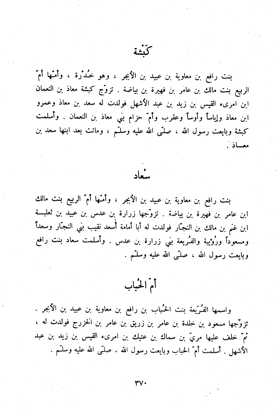 §سُعَادُ بِنْتُ رَافِعِ بْنِ مُعَاوِيَةَ بْنِ عُبَيْدِ بْنِ الْأَبْجَرِ وَأُمُّهَا أُمُّ الرَّبِيعِ بِنْتُ مَالِكِ بْنِ عَامِرِ بْنِ فُهَيْرَةَ بْنِ بَيَاضَةَ تَزَوَّجَهَا زُرَارَةُ بْنُ عُدُسِ بْنُ عُبَيْدِ بْنِ ثَعْلَبَةَ بْنِ غَنْمِ بْنِ مَالِكِ بْنِ النَّجَّارِ فَوَلَدَتْ لَهُ أَبَا أُمَامَةَ أَسْعَدَ نَقِيبَ بَنِي النَّجَّارِ وَسَعْدًا وَمَسْعُودًا وَرُؤَيْبَةَ وَالْفُرَيْعَةَ بَنِي زُرَارَةَ بْنِ عُدُسٍ وَأَسْلَمَتْ سُعَادُ بِنْتُ رَافِعٍ وَبَايَعَتْ رَسُولَ اللَّهِ صلّى الله عليه وسلم.