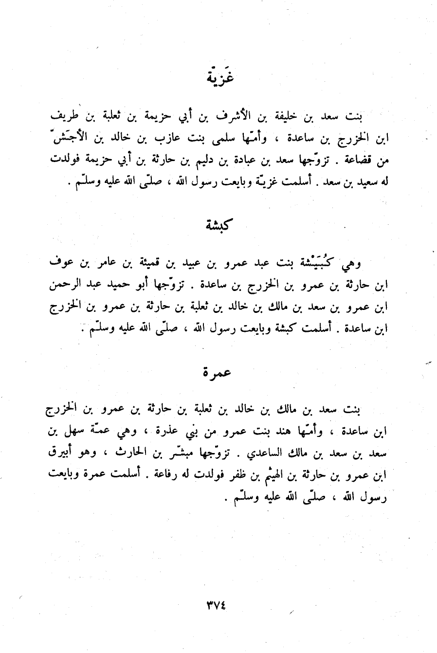 §غَزِيَّةُ بِنْتُ سَعْدِ بْنِ خَلِيفَةَ بْنِ الْأَشْرَفِ بْنِ أَبِي حُزَيْمَةَ بْنِ ثَعْلَبَةَ بْنِ طَرِيفِ بْنِ الْخَزْرَجِ بْنِ سَاعِدَةَ وَأُمُّهَا سَلْمَى بِنْتُ عَازِبِ بْنِ خَالِدِ بْنِ الْأَجَشِّ مِنْ قُضَاعَةَ تَزَوَّجَهَا سَعْدُ بْنُ عُبَادَةَ بْنِ دُلَيْمِ بْنِ حَارِثَةَ بْنِ أَبِي حُزَيْمَةَ فَوَلَدَتْ لَهُ سَعِيدَ بْنَ سَعْدٍ أَسْلَمَتْ غَزِيَّةُ وَبَايَعَتْ رَسُولَ اللَّهِ صلّى الله عليه وسلم.