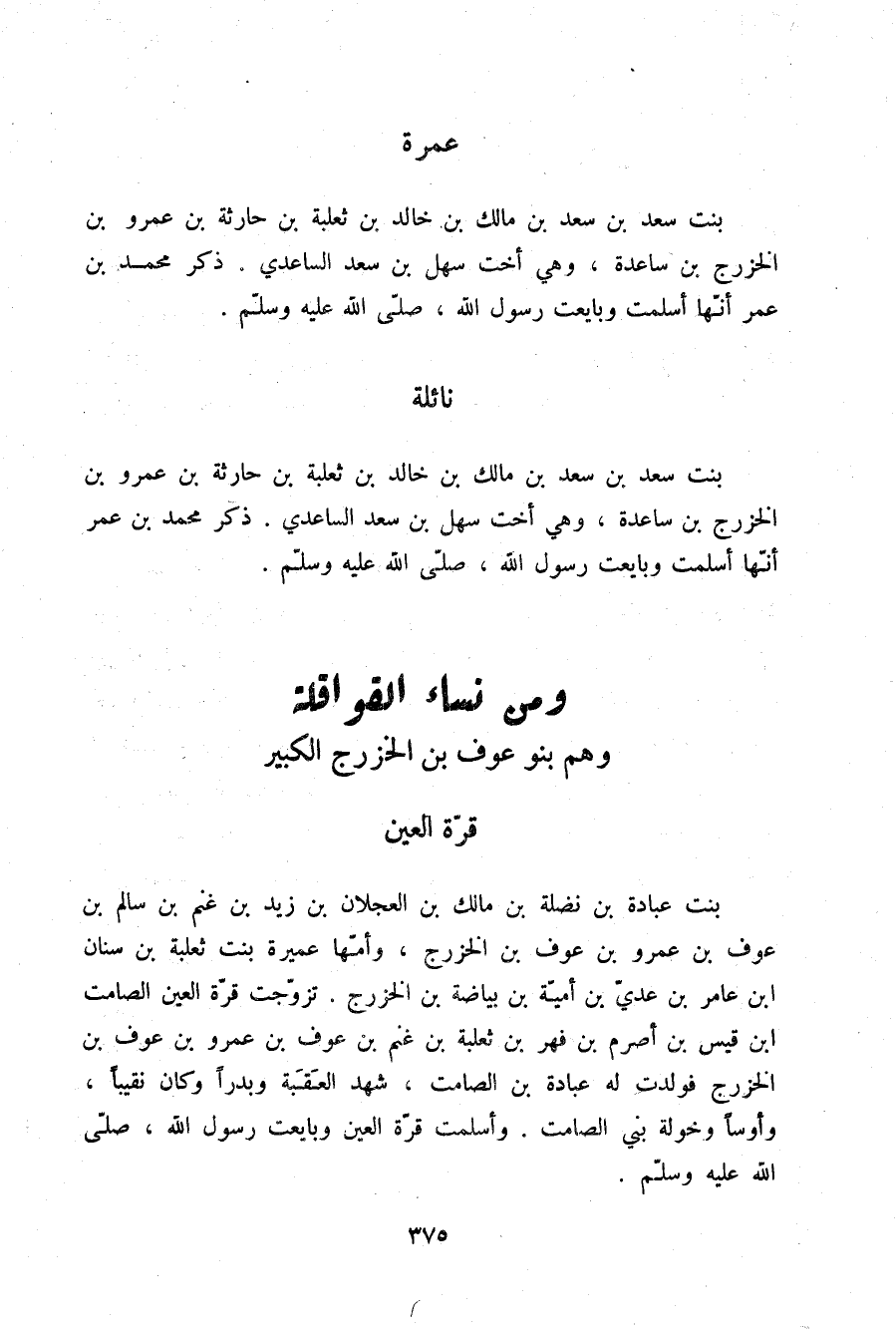 §قُرَّةُ الْعَيْنِ بِنْتُ عُبَادَةَ بْنِ نَضْلَةَ بْنِ مَالِكِ بْنِ الْعَجْلَانِ بْنِ زَيْدِ بْنِ غَنْمِ بْنِ سَالِمِ بْنِ عَوْفِ بْنِ عَمْرِو بْنِ عَوْفِ بْنِ الْخَزْرَجِ وَأُمُّهَا عُمَيْرَةُ بِنْتُ ثَعْلَبَةَ بْنِ سِنَانِ بْنِ عَامِرِ بْنِ عَدِيِّ بْنِ أُمَيَّةَ بْنِ بَيَاضَةَ بْنِ الْخَزْرَجِ تَزَوَّجَتْ قُرَّةُ الْعَيْنِ الصَّامِتَ بْنَ قَيْسِ بْنِ أَصْرَمَ بْنِ فِهْرِ بْنِ ثَعْلَبَةَ بْنِ غَنْمِ بْنِ عَوْفِ بْنِ عَمْرِو بْنِ عَوْفِ بْنِ الْخَزْرَجِ فَوَلَدَتْ لَهُ عُبَادَةَ بْنَ الصَّامِتِ شَهِدَ الْعَقَبَةَ وَبَدْرًا وَكَانَ نَقِيبًا وَأَوْسًا وَخَوْلَةَ بَنِي الصَّامِتِ وَأَسْلَمَتْ قُرَّةُ الْعَيْنِ وَبَايَعَتْ رَسُولَ اللَّهِ صلّى الله عليه وسلم