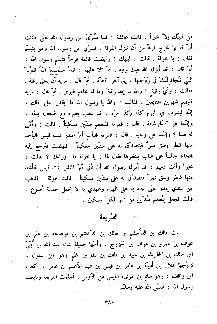 §الْفُرَيْعَةُ بِنْتُ مَالِكِ بْنِ الدُّخْشُمِ بْنِ مَالِكِ بْنِ الدُّخْشُمِ بْنِ مِرْضَخَةَ بْنِ غَنْمِ بْنِ عَوْفِ بْنِ عَمْرِو بْنِ عَوْفِ بْنِ الْخَزْرَجِ وَأُمُّهَا جَمِيلَةُ بِنْتُ عَبْدِ اللَّهِ بْنِ أُبَيِّ بْنِ مَالِكِ بْنِ الْحَارِثِ بْنِ عُبَيْدِ بْنِ مَالِكِ بْنِ سَالِمِ بْنِ غَنْمٍ وَهُوَ ابْنُ سَلُولٍ تَزَوَّجَهَا هِلَالُ بْنُ أُمَيَّةَ بْنِ عَامِرِ بْنِ قَيْسِ بْنِ عَبْدِ الْأَعْلَمِ بْنِ عَامِرِ بْنِ كَعْبِ بْنِ وَاقِفٍ وَهُوَ سَالِمُ بْنُ امْرِئِ الْقَيْسِ مِنْ الْأَوْسِ أَسْلَمَتِ الْفُرَيْعَةُ وَبَايَعَتْ رَسُولَ اللَّهِ صلّى الله عليه وسلم.