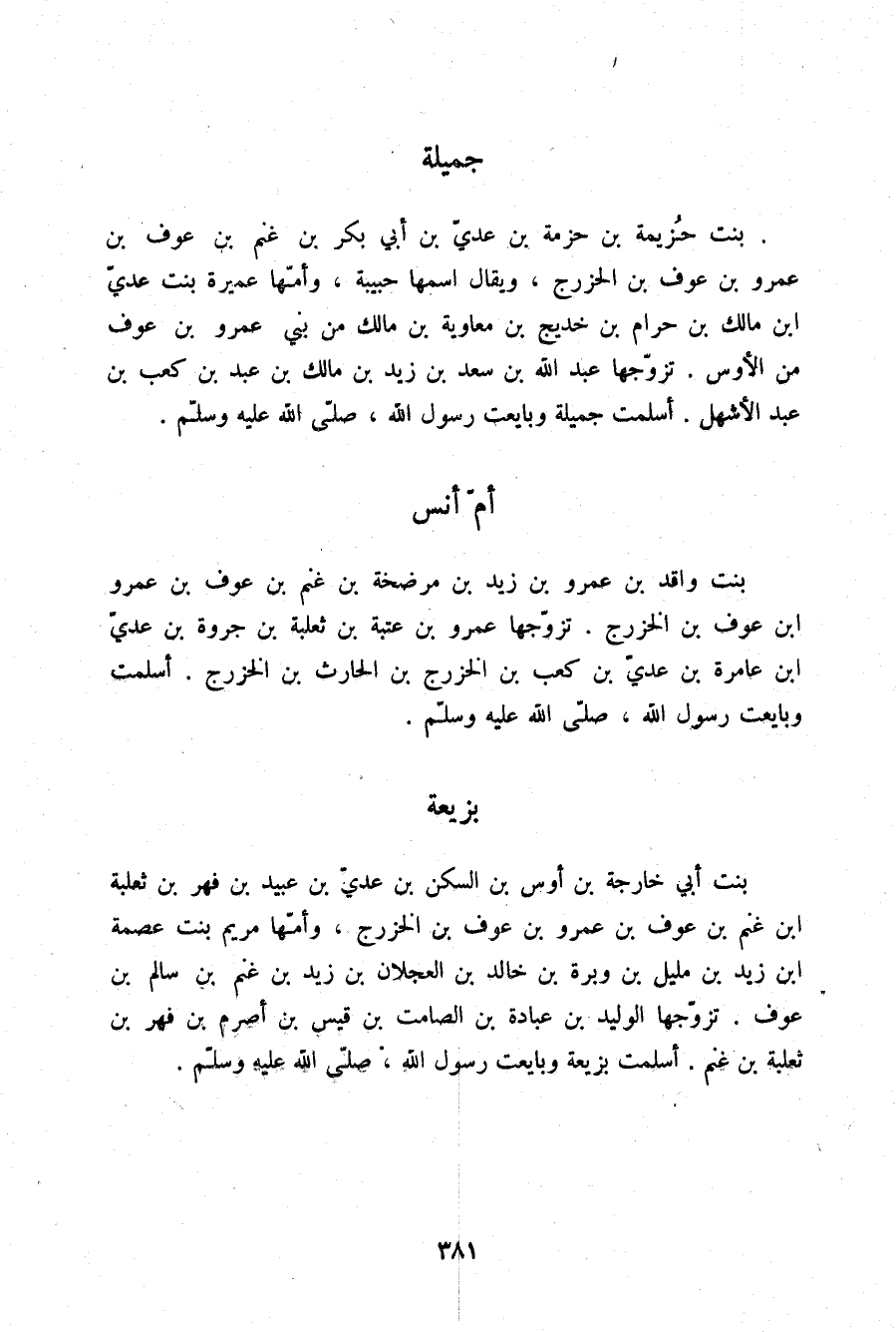 §جَمِيلَةُ بِنْتُ حُزَيْمَةَ بْنِ خَزَمَةَ بْنِ عَدِيِّ بْنِ أَبِي بَكْرِ بْنِ غَنْمِ بْنِ عَوْفِ بْنِ عَمْرِو بْنِ عَوْفِ بْنِ الْخَزْرَجِ وَيُقَالُ اسْمُهَا حَبِيبَةُ وَأُمُّهَا عَمِيرَةُ بِنْتُ عَدِيِّ بْنِ مَالِكِ بْنِ حَرَامِ بْنِ خَدِيجِ بْنِ مُعَاوِيَةَ بْنِ مَالِكٍ مِنْ بَنِي عَمْرِو بْنِ عَوْفٍ مِنَ الْأَوْسِ تَزَوَّجَهَا عَبْدُ اللَّهِ بْنُ سَعْدِ بْنِ زَيْدِ بْنِ مَالِكِ بْنِ عَبْدِ بْنِ كَعْبِ بْنِ عَبْدِ الْأَشْهَلِ أَسْلَمَتْ جَمِيلَةُ وَبَايَعَتْ رَسُولَ اللَّهِ صلّى الله عليه وسلم