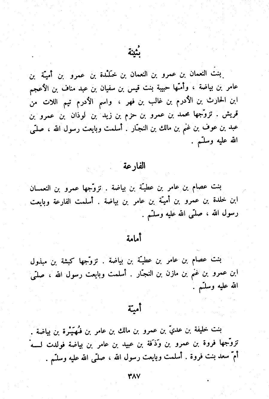 §بُثَيْنَةُ بِنْتُ النُّعْمَانِ بْنِ عَمْرِو بْنِ النُّعْمَانِ بْنِ خَلْدَةَ بْنِ عَمْرِو بْنِ أُمَيَّةَ بْنِ عَامِرِ بْنِ بَيَاضَةَ وَأُمُّهَا حَبِيبَةُ بِنْتُ قَيْسِ بْنِ سُفْيَانَ بْنِ عَبْدِ مَنَافِ بْنِ الْأَعْجَمِ بْنِ الْحَارِثِ بْنِ الْأَدْرَمِ بْنِ غَالِبِ بْنِ فِهْرٍ، وَاسْمُ الْأَدْرَمِ تَيْمُ اللَّاتِ مِنْ قُرَيْشٍ تَزَوَّجَهَا مُحَمَّدُ بْنُ عَمْرِو بْنِ حَزْمِ بْنِ زَيْدِ بْنِ لَوْذَانَ بْنِ عَمْرِو بْنِ عَبْدِ بْنِ عَوْفِ بْنِ غَنْمِ بْنِ مَالِكِ بْنِ النَّجَّارِ أَسْلَمَتْ وَبَايَعَتْ رَسُولَ اللَّهِ صلّى الله عليه وسلم.