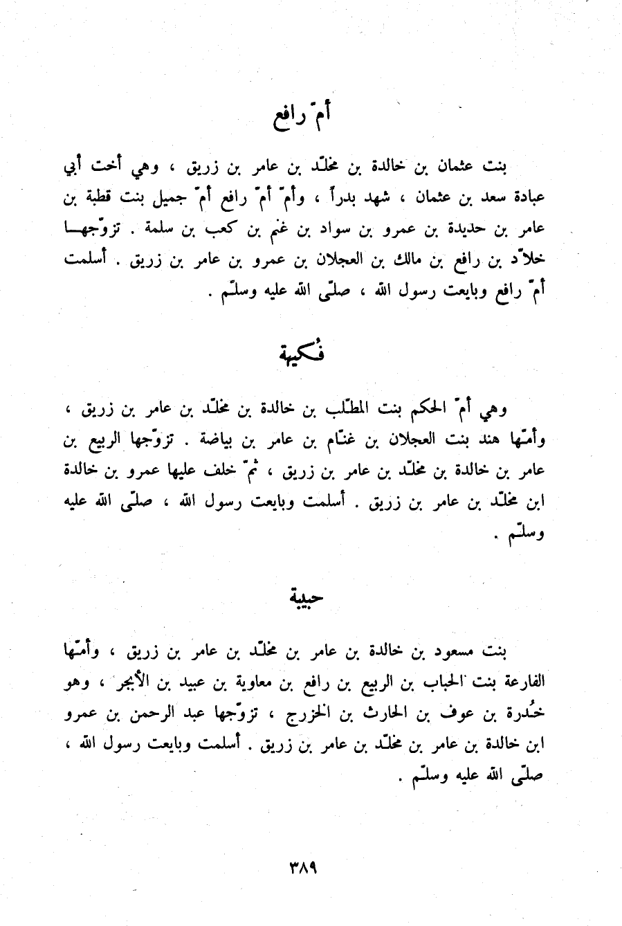 §فُكَيْهَةُ وَهِيَ أُمُّ الْحَكَمِ بِنْتِ الْمُطَّلِبِ بْنِ خَلْدَةَ بْنِ مَخْلَدِ بْنِ عَامِرِ بْنِ زُرَيْقٍ وَأُمُّهَا هِنْدُ بِنْتُ الْعَجْلَانَ بْنِ غَنَّامِ بْنِ عَامِرِ بْنِ بَيَاضَةَ تَزَوَّجَهَا الرَّبِيعُ بْنُ عَامِرِ بْنِ خَلْدَةَ بْنِ مَخْلَدِ بْنِ عَامِرِ بْنِ زُرَيْقٍ ثُمَّ خَلَفَ عَلَيْهَا عَمْرُو بْنُ خَالِدَةَ بْنِ مَخْلَدِ بْنِ عَامِرِ بْنِ زُرَيْقٍ، أَسْلَمَتْ وَبَايَعَتْ رَسُولَ اللَّهِ صلّى الله عليه وسلم.