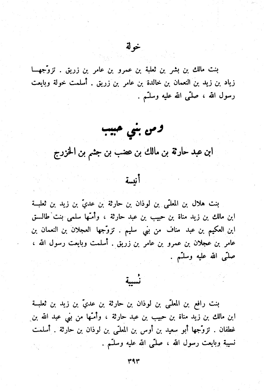 §خَوْلَةُ بِنْتُ مَالِكِ بْنِ بِشْرِ بْنِ ثَعْلَبَةَ بْنِ عَمْرِو بْنِ عَامِرِ بْنِ زُرَيْقٍ تَزَوَّجَهَا زِيَادُ بْنُ زَيْدِ بْنِ النُّعْمَانِ بْنِ خَلْدَةَ بْنِ عَامِرِ بْنِ زُرَيْقٍ أَسْلَمَتْ خَوْلَةُ وَبَايَعَتْ رَسُولَ اللَّهِ صلّى الله عليه وسلم
