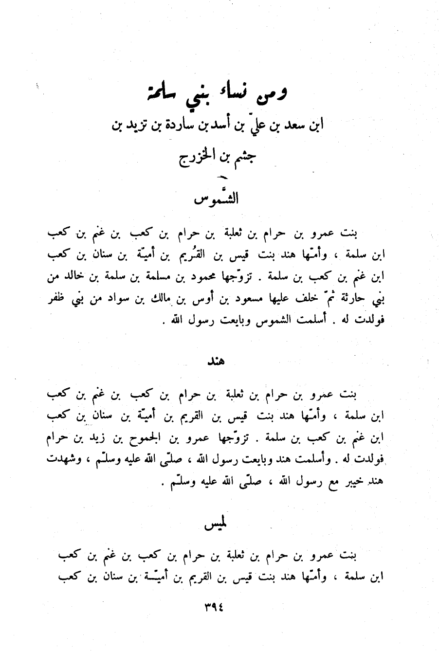 §وَمِنْ نِسَاءِ بَنِي سَلِمَةَ بْنِ سَعْدِ بْنِ عَلِيِّ بْنِ أَسَدِ بْنِ سَارِدَةَ بْنِ تَزِيدَ بْنِ جُشَمِ بْنِ الْخَزْرَجِ