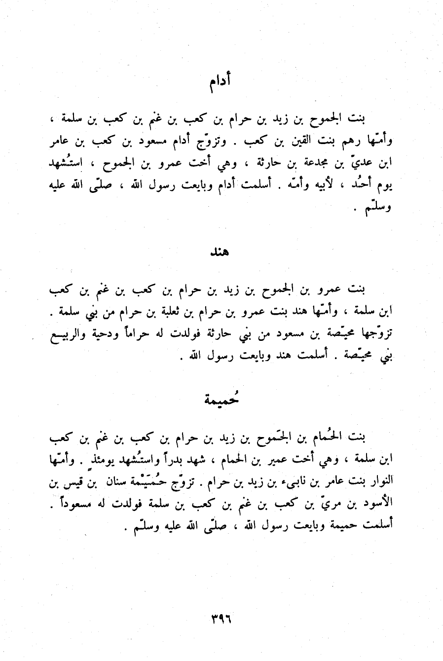 §إِدَامُ بِنْتُ الْجَمُوحِ بْنِ زَيْدِ بْنِ حَرَامِ بْنِ كَعْبِ بْنِ غَنْمِ بْنِ كَعْبِ بْنِ سَلَمَةَ وَأُمُّهَا رُهْمُ بِنْتُ الْقَيْنِ بْنِ كَعْبٍ وَتَزَوَّجَ أَدَامَ مَسْعُودُ بْنُ كَعْبِ بْنِ عَامِرِ بْنِ عَدِيِّ بْنِ مَجْدَعَةَ بْنِ حَارِثَةَ وَهِيَ أُخْتُ عَمْرِو بْنِ الْجَمُوحِ اسْتُشْهِدَ يَوْمَ أُحُدٍ لِأَبِيهِ وَأُمِّهِ أَسْلَمَتْ أَدَامُ وَبَايَعَتْ رَسُولَ اللَّهِ صلّى الله عليه وسلم.