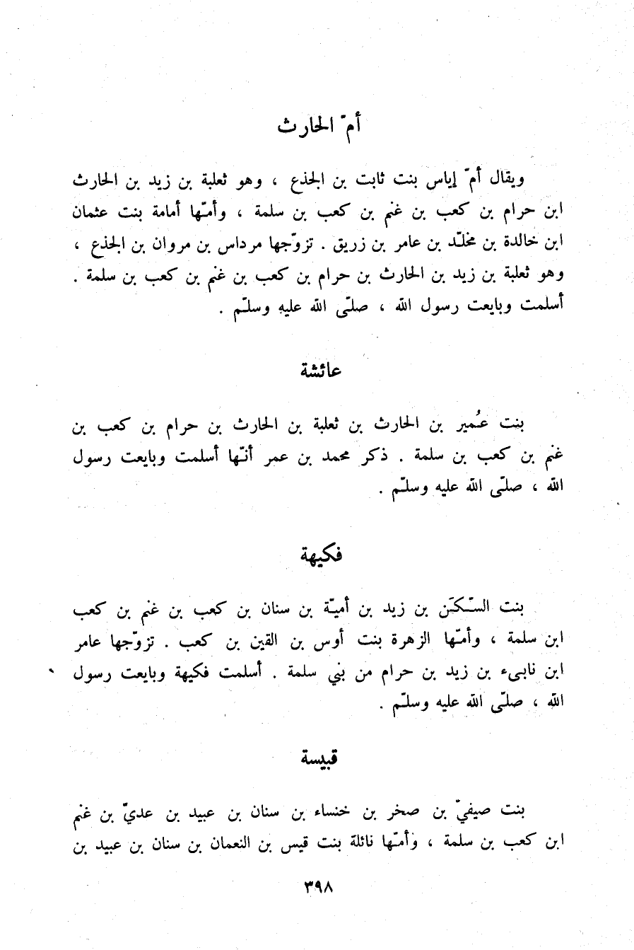 §عَائِشَةُ بِنْتُ عُمَيْرِ بْنِ الْحَارِثِ بْنِ ثَعْلَبَةَ بْنِ الْحَارِثِ بْنِ حَرَامِ بْنِ كَعْبِ بْنِ غَنْمِ بْنِ كَعْبِ بْنِ سَلَمَةَ ذَكَرَ مُحَمَّدُ بْنُ عُمَرَ أَنَّهَا أَسْلَمَتْ وَبَايَعَتْ رَسُولَ اللَّهِ صلّى الله عليه وسلم.