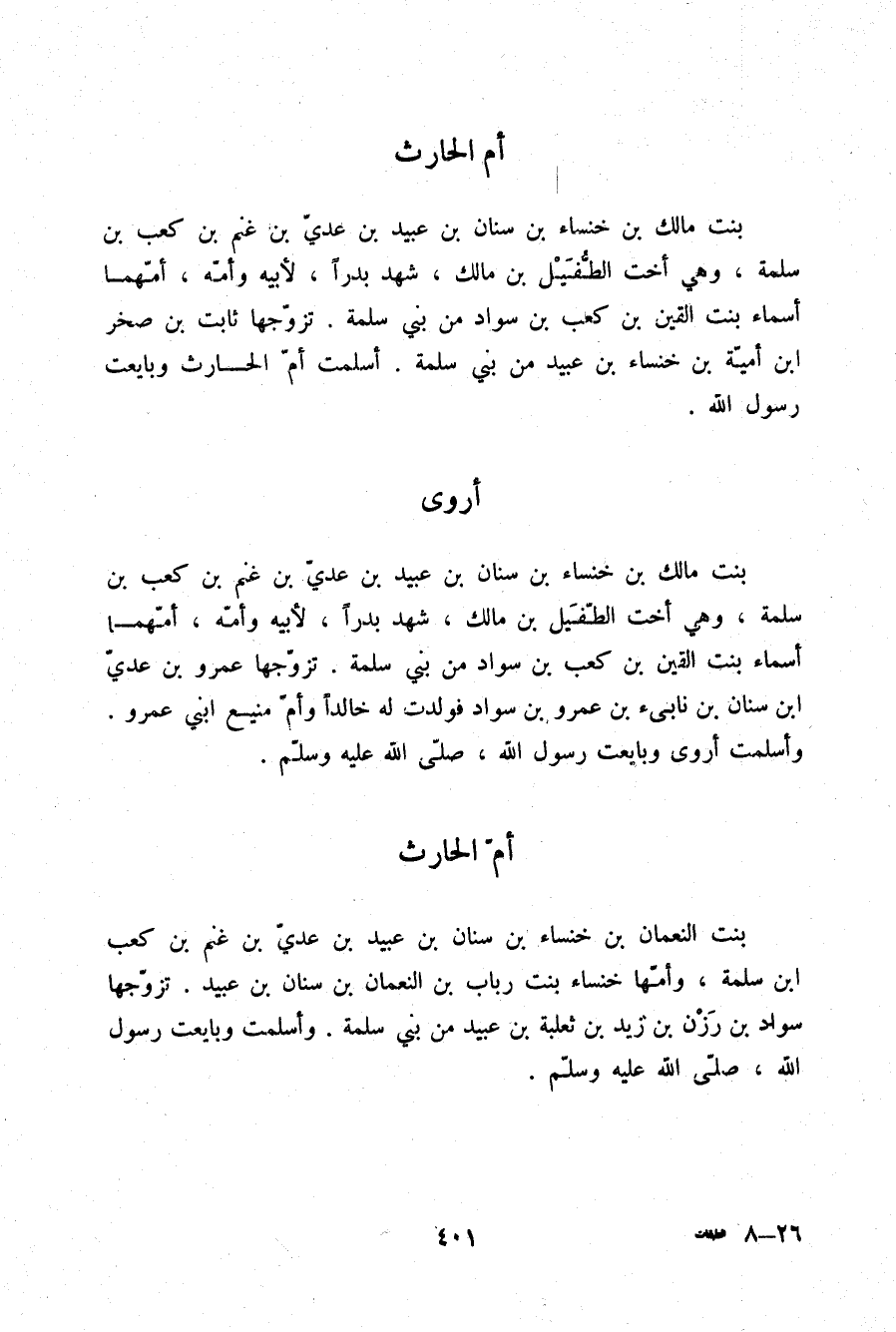 §أُمُّ الْحَارِثِ بِنْتُ النُّعْمَانِ بْنِ خَنْسَاءَ بْنِ سِنَانِ بْنِ عُبَيْدِ بْنِ عَدِيِّ بْنِ غَنْمِ بْنِ كَعْبِ بْنِ سَلَمَةَ وَأُمُّهَا خَنْسَاءُ بِنْتُ رَبَابِ بْنِ النُّعْمَانِ بْنِ سِنَانِ بْنِ عُبَيْدٍ تَزَوَّجَهَا سَوَّادُ بْنُ رَزْنِ بْنِ زَيْدِ بْنِ ثَعْلَبَةَ بْنِ عُبَيْدٍ مِنْ بَنِي سَلِمَةَ وَأَسْلَمَتْ وَبَايَعَتْ رَسُولَ اللَّهِ صلّى الله عليه وسلم.