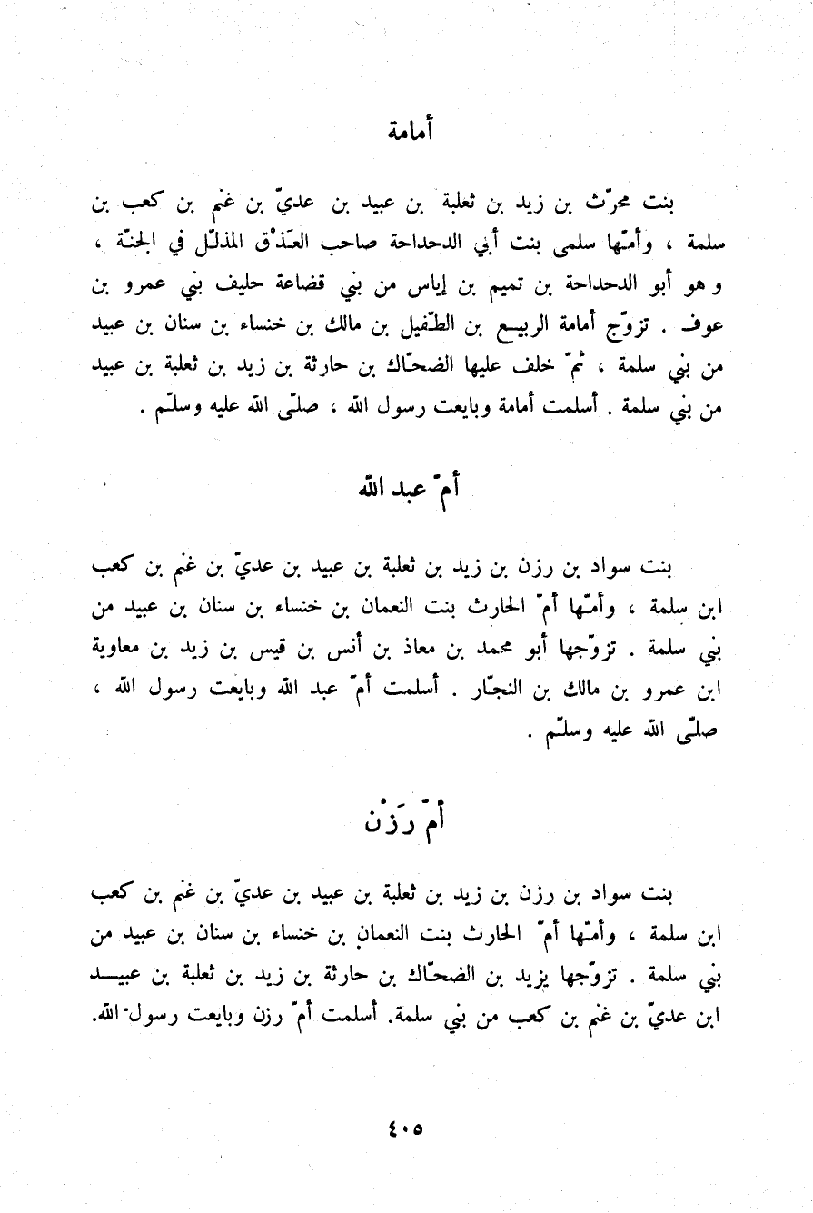 §أُمُّ عَبْدِ اللَّهِ بِنْتُ سَوَّادِ بْنِ رَزْنِ بْنِ زَيْدِ بْنِ ثَعْلَبَةَ بْنِ عُبَيْدِ بْنِ عَدِيِّ بْنِ غَنْمِ بْنِ كَعْبِ بْنِ سَلَمَةَ وَأُمُّهَا أُمُّ الْحَارِثِ بِنْتُ النُّعْمَانِ بْنِ خَنْسَاءَ بْنِ سِنَانِ بْنِ عُبَيْدٍ مِنْ بَنِي سَلِمَةَ تَزَوَّجَهَا أَبُو مُحَمَّدِ بْنُ مُعَاذِ بْنِ أَنَسِ بْنِ قَيْسِ بْنِ زَيْدِ بْنِ مُعَاوِيَةَ بْنِ عَمْرِو بْنِ مَالِكِ بْنِ النَّجَّارِ أَسْلَمَتْ أُمُّ عَبْدِ اللَّهِ وَبَايَعَتْ رَسُولَ اللَّهِ صلّى الله عليه وسلم.