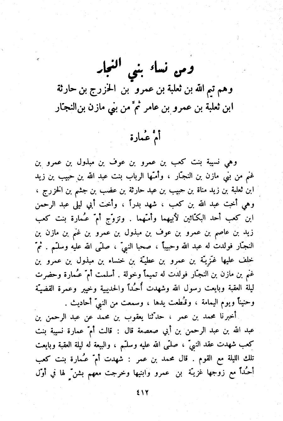 §أُمُّ عُمَارَةَ وَهِيَ نُسَيْبَةُ بِنْتُ كَعْبِ بْنِ عَمْرِو بْنِ عَوْفِ بْنِ مَبْذُولِ بْنِ عَمْرِو بْنِ غَنْمٍ مِنْ بَنِي مَازِنِ بْنِ النَّجَّارِ وَأُمُّهَا الرَّبَابُ بِنْتُ عَبْدِ اللَّهِ بْنِ حَبِيبِ بْنِ زَيْدِ بْنِ ثَعْلَبَةَ بْنِ زَيْدِ مَنَاةَ بْنِ حَبِيبِ بْنِ عَبْدِ حَارِثَةَ بْنِ غَضْبِ بْنِ جُشَمِ بْنِ الْخَزْرَجِ وَهِيَ أُخْتُ عَبْدِ اللَّهِ بْنِ كَعْبٍ شَهِدَ بَدْرًا وَأُخْتُ أَبِي لَيْلَى عَبْدِ الرَّحْمَنِ بْنِ كَعْبٍ أَحَدِ الْبَكَّائِينَ - لِأَبِيهِمَا وَأُمِّهِمَا، وَتَزَوَّجَ أُمَّ عُمَارَةَ بِنْتَ كَعْبٍ زَيْدُ بْنُ عَاصِمِ بْنِ عَمْرِو بْنِ عَوْفِ بْنِ مَبْذُولِ بْنِ عَمْرِو بْنِ غَنْمِ بْنِ مَازِنِ بْنِ النَّجَّارِ فَوَلَدَتْ لَهُ عَبْدَ اللَّهِ وَحَبِيبًا صَحِبَا النَّبِيَّ صلّى الله عليه وسلم ثُمَّ خَلَفَ عَلَيْهَا غَزِيَّةُ بْنُ عَمْرِو بْنِ عَطِيَّةَ بْنِ خَنْسَاءَ بْنِ مَبْذُولِ بْنِ عَمْرِو بْنِ غَنْمِ بْنِ مَازِنِ بْنِ النَّجَّارِ فَوَلَدَتْ لَهُ تَمِيمًا وَخَوْلَةَ، أَسْلَمَتْ أُمُّ عُمَارَةَ وَحَضَرَتْ لَيْلَةَ الْعَقَبَةِ وَبَايَعَتْ رَسُولَ اللَّهِ وَشَهِدَتْ أُحُدًا وَالْحُدَيْبِيَةَ وَخَيْبَرَ وَعُمْرَةَ الْقَضِيَّةِ وَحُنَيْنًا وَيَوْمَ الْيَمَامَةِ وَقُطِعَتْ يَدُهَا، وَسَمِعَتْ مِنَ النَّبِيِّ أَحَادِيثَ