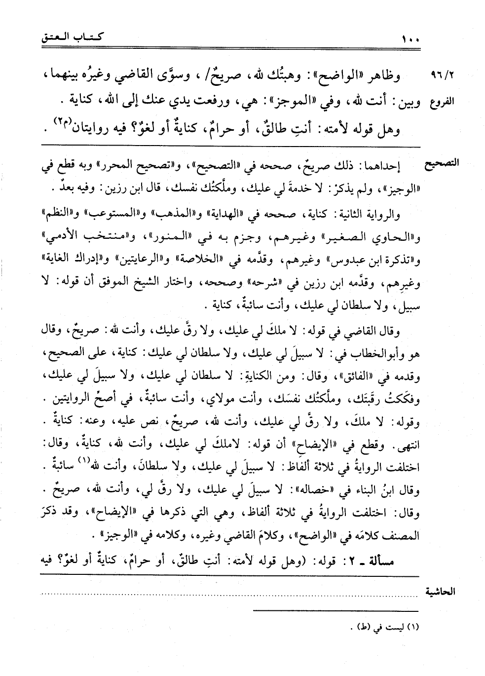 وَقَالَ الْقَاضِي فِي قَوْلِهِ: لَا مِلْكَ لِي عَلَيْك وَلَا رِقَّ لِي عَلَيْك، وَأَنْتَ لِلَّهِ، صَرِيحٌ، وَقَالَ هُوَ وَأَبُو الْخَطَّابِ فِي: لَا سَبِيلَ لِي عَلَيْك، وَلَا سُلْطَانَ لِي عَلَيْك: كِنَايَةٌ، عَلَى الصَّحِيحِ، وَقَدَّمَهُ فِي الْفَائِقِ، وَقَالَ: وَمِنْ الْكِنَايَةِ، لَا سُلْطَانَ لِي عَلَيْك، وَلَا سَبِيلَ لِي عَلَيْك، وَفَكَكْت رَقَبَتَك، وَمَلَّكْتُك نَفْسَك، وَأَنْتَ مَوْلَايَ، وَأَنْتَ سَائِبَةٌ، فِي أَصَحِّ الرِّوَايَتَيْنِ، وَقَوْلُهُ: لَا مِلْكَ، وَلَا رِقَّ لِي عَلَيْك، وَأَنْتَ لِلَّهِ، صَرِيحٌ، نَصَّ عَلَيْهِ، وَعَنْهُ: كِنَايَةٌ. انْتَهَى. وَقَطَعَ فِي الْإِيضَاحِ أَنَّ قَوْلَهُ: لَا مِلْكَ لِي عَلَيْك، وَأَنْتَ لِلَّهِ، كِنَايَةٌ، وَقَالَ: اخْتَلَفَتْ الرِّوَايَةُ فِي ثَلَاثَةِ أَلْفَاظٍ: لَا سَبِيلَ لِي عَلَيْك، وَلَا سلطان، وأنت لله1 سَائِبَةٌ. وَقَالَ ابْنُ الْبَنَّا فِي خِصَالِهِ: لَا سَبِيلَ لِي عَلَيْك، وَلَا رِقَّ لِي، وَأَنْتَ لِلَّهِ، صَرِيحٌ، وَقَالَ: اخْتَلَفَتْ الرِّوَايَةُ فِي ثَلَاثَةِ أَلْفَاظٍ، وَهِيَ الَّتِي ذَكَرَهَا فِي الْإِيضَاحِ، وَقَدْ ذَكَرَ الْمُصَنِّفُ كَلَامَهُ فِي الْوَاضِحِ وَكَلَامَ الْقَاضِي وغيره وكلامه في الموجز.