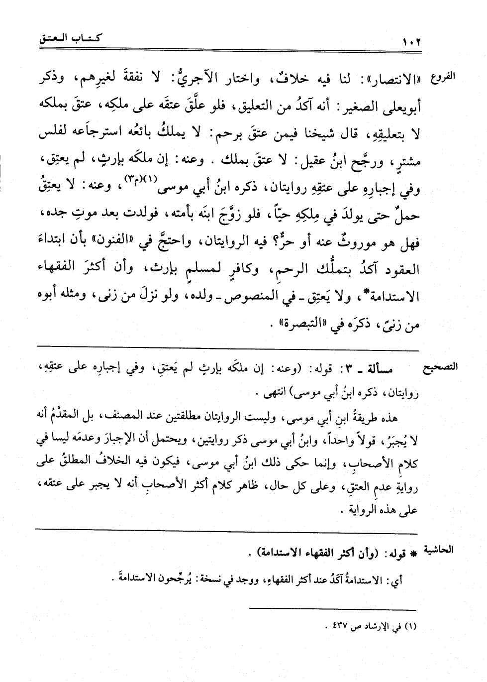 الِانْتِصَارِ: لَنَا فِيهِ خِلَافٌ، وَاخْتَارَ الْآجُرِّيُّ: لَا نَفَقَةَ لِغَيْرِهِمْ، وَذَكَرَ أَبُو يَعْلَى الصَّغِيرُ أَنَّهُ آكَدُ مِنْ التَّعْلِيقِ. فَلَوْ عَلَّقَ عِتْقَهُ عَلَى مِلْكِهِ عَتَقَ بِمِلْكِهِ لَا بِتَعْلِيقِهِ، قَالَ شَيْخُنَا فِيمَنْ عَتَقَ بِرَحِمٍ: لَا يَمْلِكُ بَائِعُهُ اسْتِرْجَاعَهُ لِفَلَسِ مُشْتَرٍ، وَرَجَّحَ ابْنُ عَقِيلٍ: لَا عِتْقَ بِمِلْكٍ، وَعَنْهُ: إنْ مَلَكَهُ بِإِرْثٍ لَمْ يُعْتَقْ، وَفِي إجْبَارِهِ عَلَى عِتْقِهِ رِوَايَتَانِ، ذَكَرَهُ ابْنُ أَبِي مُوسَى1 "م 3" وَعَنْهُ: لَا يُعْتَقُ حَمْلٌ حتى يُولَدَ فِي مِلْكِهِ حَيًّا، فَلَوْ زَوَّجَ ابْنَهُ بِأَمَتِهِ فَوَلَدَتْ بَعْدَ مَوْتِ جَدِّهِ فَهَلْ هُوَ مَوْرُوثٌ عَنْهُ أَوْ حُرٌّ؟ فِيهِ الرِّوَايَتَانِ، وَاحْتَجَّ فِي الْفُنُونِ بِأَنَّ ابْتِدَاءَ الْعُقُودِ آكَدُ بِتَمَلُّكِ الرَّحِمِ، وَكَافِرٌ لِمُسْلِمٍ بِإِرْثٍ، وَأَنَّ أَكْثَرَ الْفُقَهَاءِ الِاسْتِدَامَةُ، وَلَا يُعْتَقُ فِي الْمَنْصُوصِ وَلَدُهُ وَلَوْ نَزَلَ مِنْ زِنًا، وَمِثْلُهُ أَبُوهُ مِنْ زِنًا، ذكره في التبصرة.