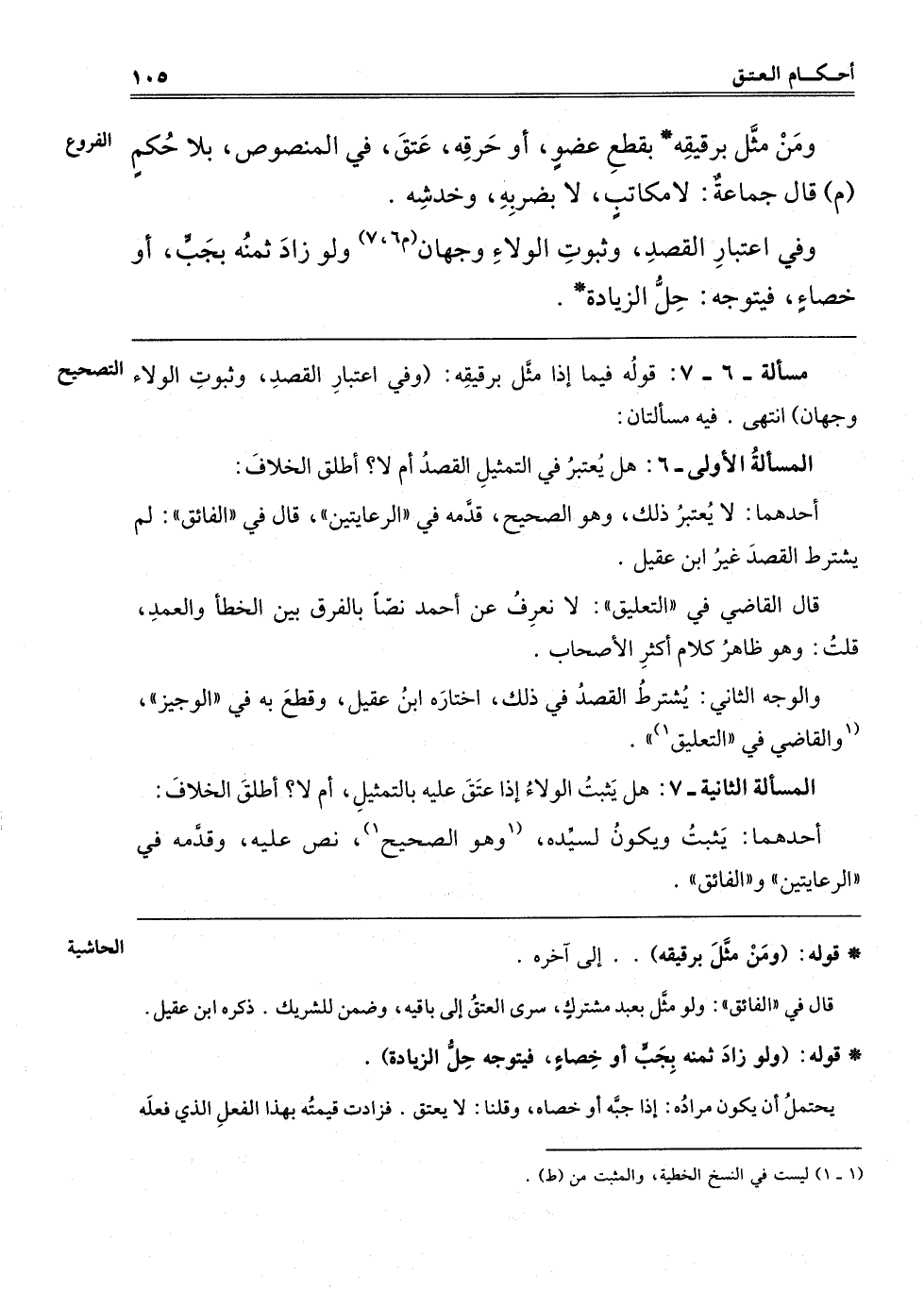 ـــــــــــــــــــــــــــــQمَسْأَلَةٌ – 6- 7: قَوْلُهُ فِيمَا إذَا مَثَّلَ بِرَقِيقِهِ: "وَفِي اعْتِبَارِ الْقَصْدِ وَثُبُوتِ الْوَلَاءِ وَجْهَانِ". انْتَهَى. فِيهِ مَسْأَلَتَانِ: