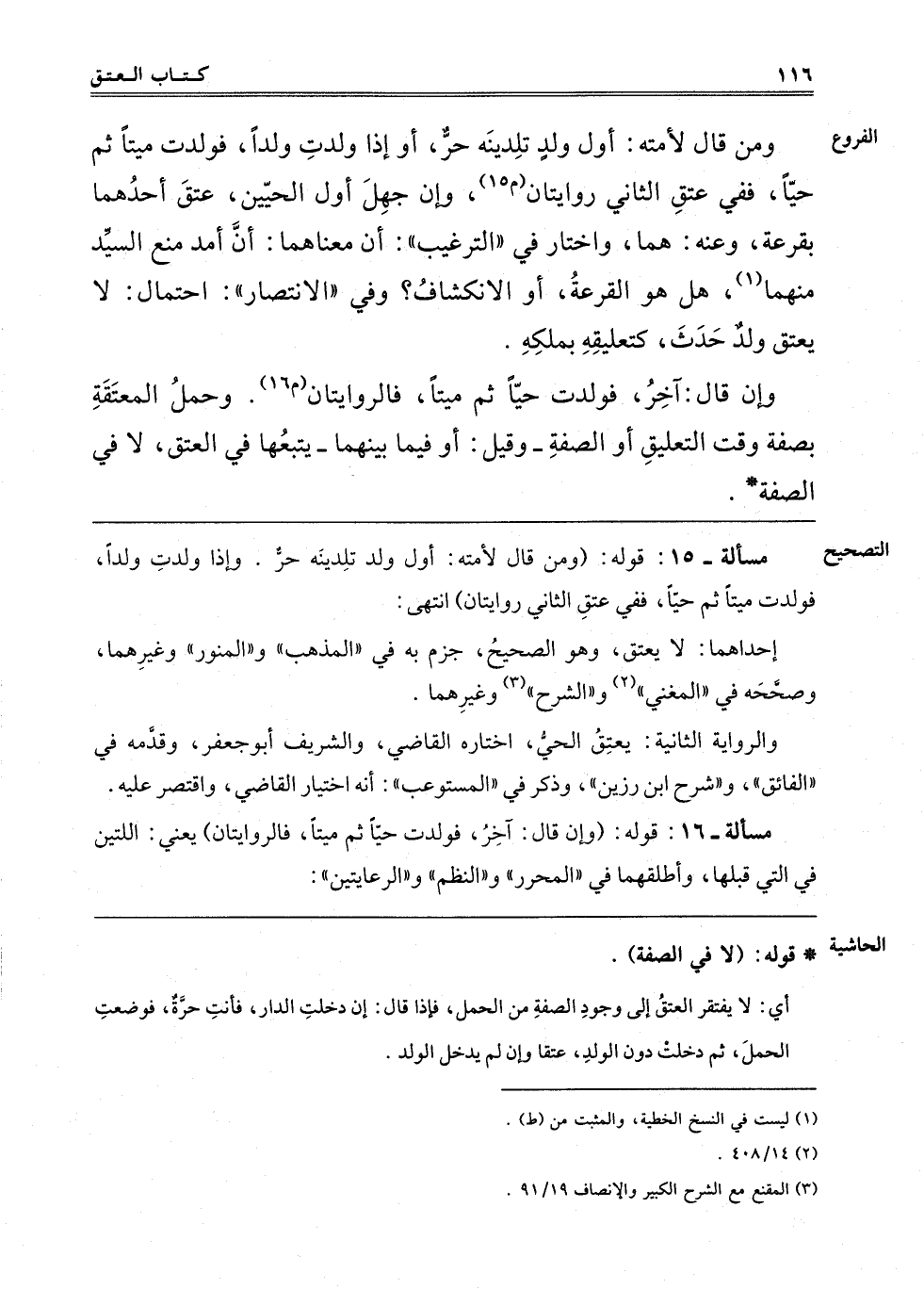 وَإِنْ قَالَ: آخَرُ، فَوَلَدَتْ حَيًّا ثُمَّ مَيِّتًا فَالرِّوَايَتَانِ "م 16" وَحَمْلُ المعتقة بصفة وَقْتَ التَّعْلِيقِ أَوْ الصِّفَةِ وَقِيلَ أَوْ فِيمَا بَيْنَهُمَا يَتْبَعُهَا فِي الْعِتْقِ لَا فِي الصِّفَةِ.