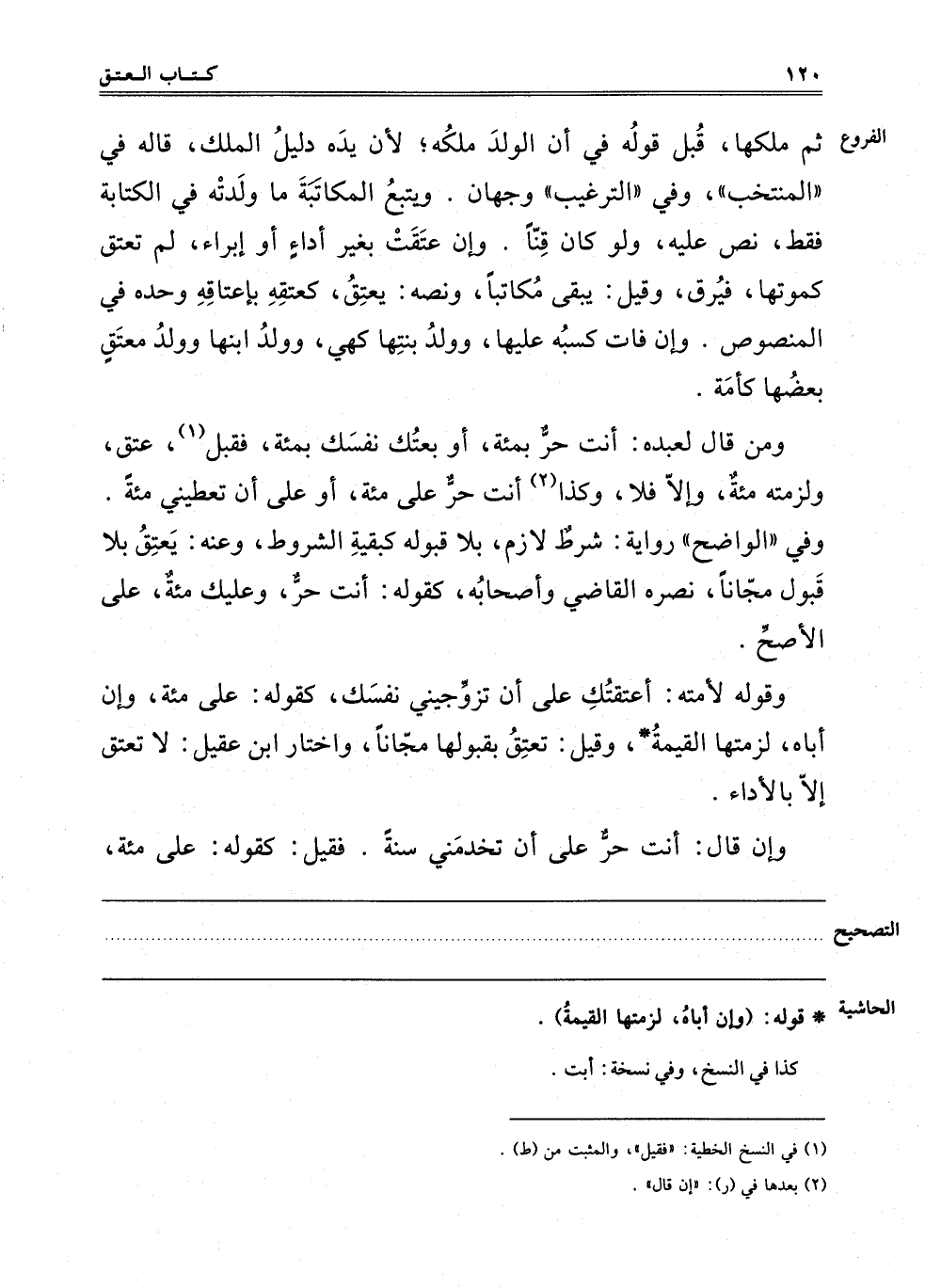 وَمَنْ قَالَ لِعَبْدِهِ: أَنْتَ حُرٌّ بِمِائَةٍ أَوْ بِعْتُك نَفْسَك بِمِائَةٍ فَقَبِلَ1 عَتَقَ وَلَزِمَتْهُ مِائَةٌ وَإِلَّا فَلَا، وَكَذَا2 أَنْتَ حُرٌّ عَلَى مِائَةٍ أَوْ عَلَى أَنْ تُعْطِيَنِي مِائَةً. وَفِي الْوَاضِحِ رِوَايَةٌ: شَرْطٌ لَازِمٌ بِلَا قَبُولِهِ كَبَقِيَّةِ الشُّرُوطِ، وَعَنْهُ: يُعْتَقُ بِلَا قَبُولٍ مَجَّانًا، نَصَرَهُ الْقَاضِي وَأَصْحَابُهُ، كَقَوْلِهِ: أَنْتَ حُرٌّ وَعَلَيْك مِائَةٌ، عَلَى الْأَصَحِّ.