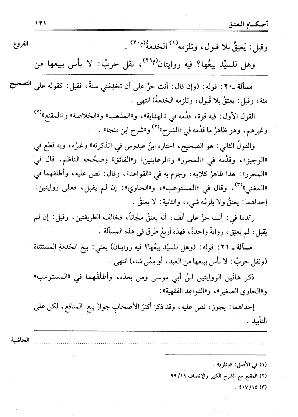 مَسْأَلَةٌ – 21: قَوْلُهُ: "وَهَلْ لِلسَّيِّدِ بَيْعُهَا؟ فِيهِ رِوَايَتَانِ"، يَعْنِي بَيْعَ الْخِدْمَةِ الْمُسْتَثْنَاةِ، "وَنَقَلَ حَرْبٌ: لَا بَأْسَ بِبَيْعِهَا مِنْ الْعَبْدِ أَوْ مِمَّنْ شَاءَ". انْتَهَى.