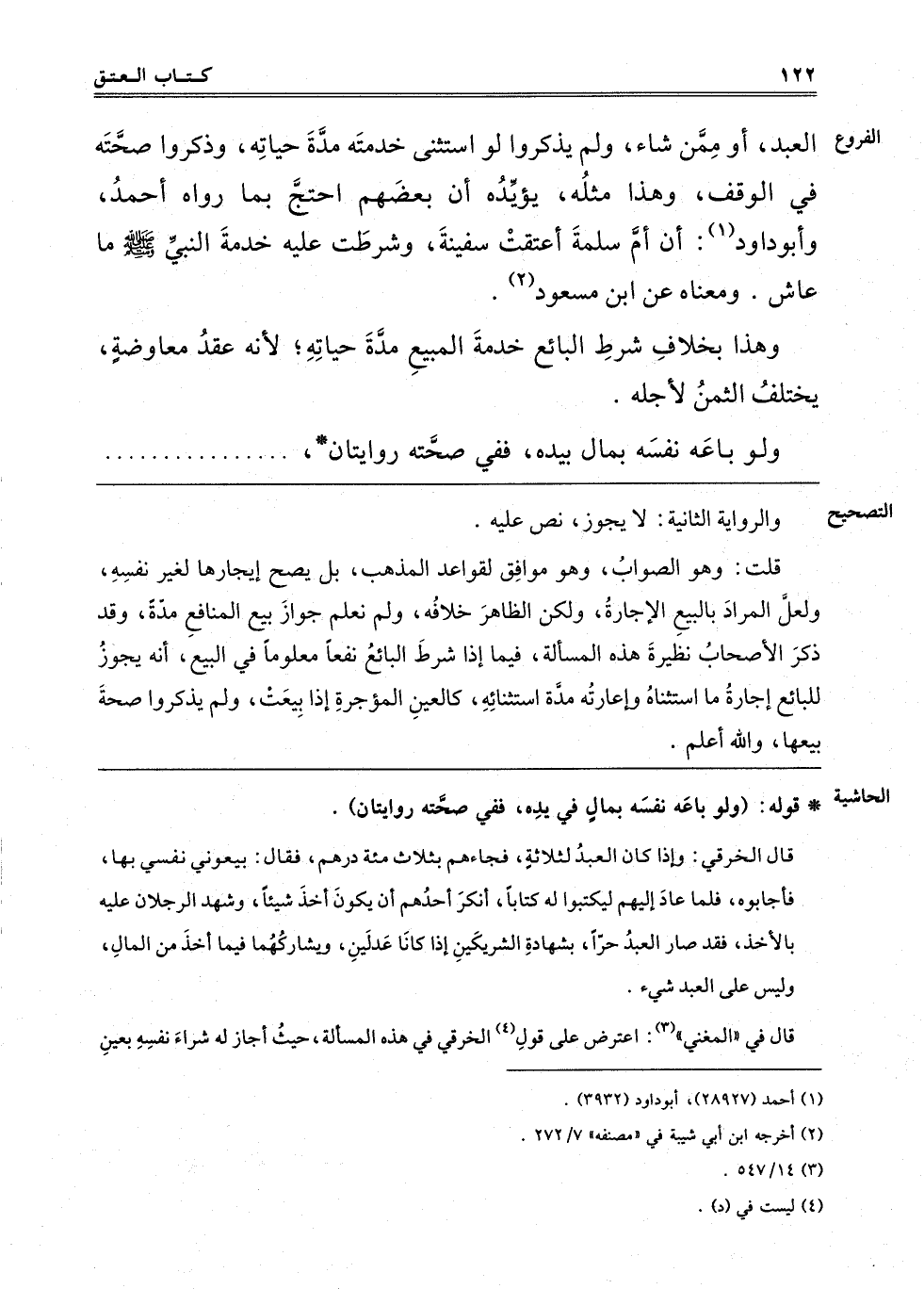 الْعَبْدِ أَوْ مِمَّنْ شَاءَ، وَلَمْ يَذْكُرُوا لَوْ اسْتَثْنَى خِدْمَتَهُ مُدَّةَ حَيَاتِهِ وَذَكَرُوا صِحَّتَهُ فِي الْوَقْفِ، وَهَذَا مِثْلُهُ، يُؤَيِّدُهُ أَنَّ بَعْضَهُمْ احْتَجَّ بِمَا رَوَاهُ أَحْمَدُ وَأَبُو دَاوُد1: أَنَّ أُمَّ سَلَمَةَ أَعْتَقَتْ سَفِينَةَ وَشَرَطَتْ عَلَيْهَا خِدْمَةَ النَّبِيِّ صَلَّى اللَّهُ عَلَيْهِ وَسَلَّمَ مَا عَاشَ، وَمَعْنَاهُ عَنْ ابْنِ مَسْعُودٍ2.