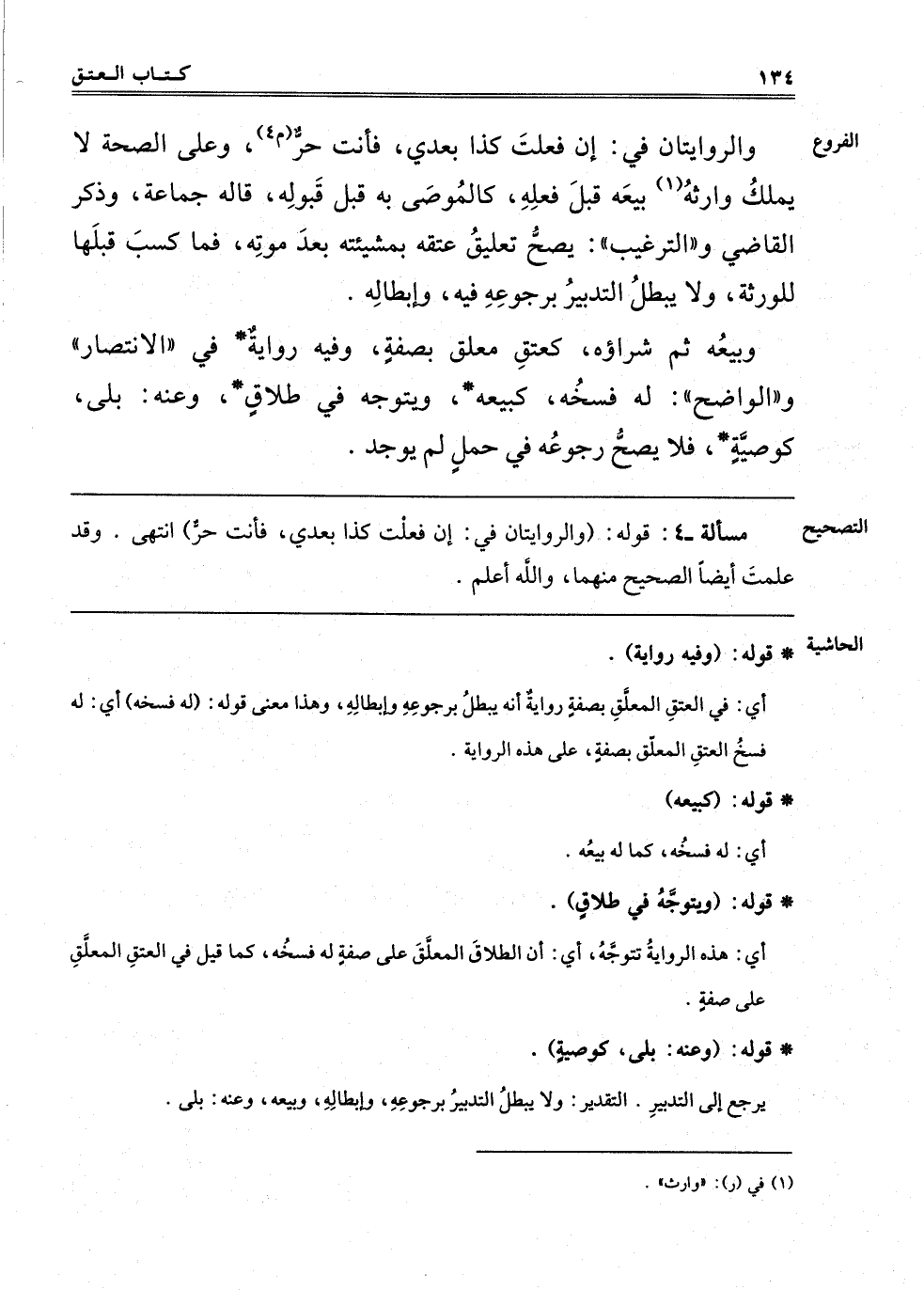 وَالرِّوَايَتَانِ فِي: إنْ فَعَلْت كَذَا بَعْدِي فَأَنْتَ حُرٌّ "م 4" وَعَلَى الصِّحَّةِ لَا يَمْلِكُ وَارِثُهُ1 بَيْعَهُ قَبْلَ فِعْلِهِ، كَالْمُوصَى بِهِ قَبْلَ قَبُولِهِ، قَالَهُ جَمَاعَةٌ، وَذَكَرَ الْقَاضِي وَالتَّرْغِيبُ: يَصِحُّ تَعْلِيقُ عِتْقِهِ بِمَشِيئَتِهِ بَعْدَ مَوْتِهِ، فَمَا كَسَبَ قَبْلَهَا لِلْوَرَثَةِ، وَلَا يَبْطُلُ التَّدْبِيرُ بِرُجُوعِهِ فِيهِ، وَإِبْطَالُهُ.