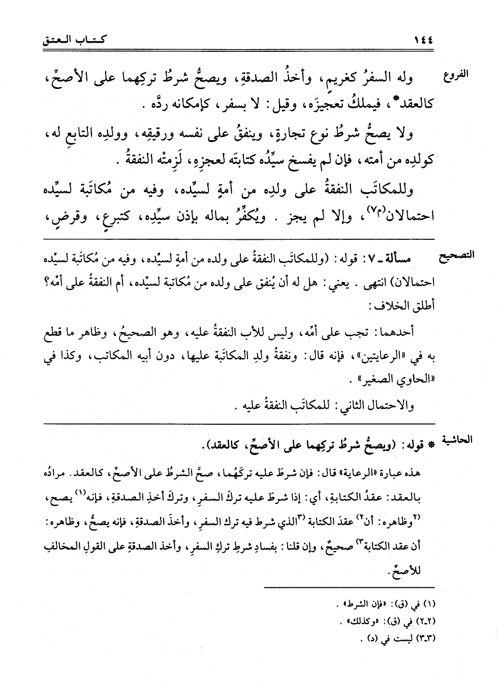 ـــــــــــــــــــــــــــــQمَسْأَلَةٌ – 7: قَوْلُهُ: "وَلِلْمُكَاتَبِ النَّفَقَةُ عَلَى وَلَدِهِ مِنْ أَمَةٍ لِسَيِّدِهِ، وَفِيهِ مِنْ مُكَاتَبَةٍ لِسَيِّدِهِ احْتِمَالَانِ". انْتَهَى. يَعْنِي هَلْ لَهُ أَنْ يُنْفِقَ عَلَى وَلَدِهِ مِنْ مُكَاتَبَةٍ لِسَيِّدِهِ أَمْ النَّفَقَةُ عَلَى أُمِّهِ؟ أَطْلَقَ الْخِلَافَ: