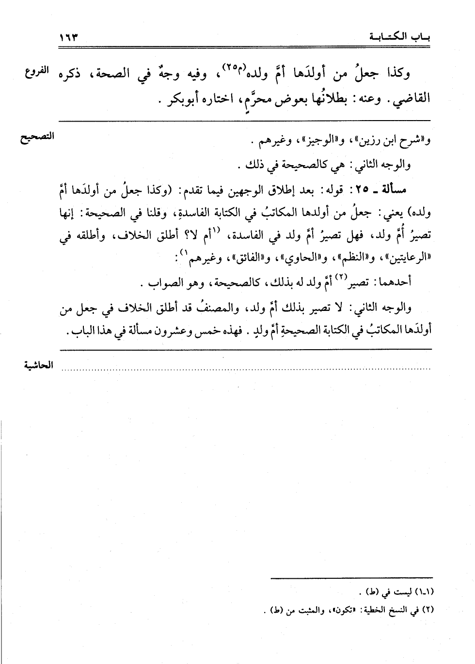 مَسْأَلَةٌ – 25: قَوْلُهُ: بَعْدَ إطْلَاقِ الْوَجْهَيْنِ فِيمَا تَقَدَّمَ: "وَكَذَا جَعْلُ مَنْ أَوْلَدَهَا أُمَّ وَلَدِهِ" يَعْنِي: جَعْلَ مَنْ أَوْلَدَهَا الْمُكَاتَبُ فِي الْكِتَابَةِ الْفَاسِدَةِ وَقُلْنَا فِي الصَّحِيحَةِ: إنَّهَا تَصِيرُ أُمَّ وَلَدٍ، فهل تصير أم ولد في الفاسدة1 أَمْ لَا؟ أَطْلَقَ الْخِلَافَ، وَأَطْلَقَهُ فِي "الرِّعَايَتَيْنِ"، و"النظم"، و"الحاوي"، و"الفائق"، وغيرهم1: