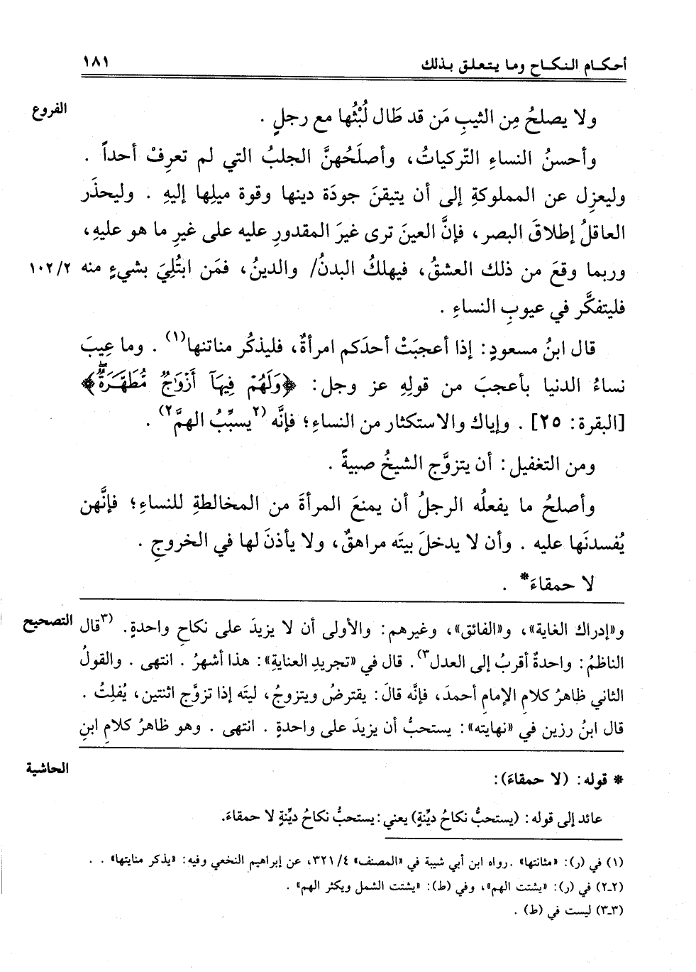 قَالَ ابْنُ مسعود: إذا أعجبت أحدكم امرأة فليذكر مناتنها1، وَمَا عِيبَ نِسَاءُ الدُّنْيَا بِأَعْجَبَ مِنْ قَوْلِهِ عَزَّ وَجَلَّ {وَلَهُمْ فِيهَا أَزْوَاجٌ مُطَهَّرَةٌ} [البقرة: 25] وإياك والاستكثار من النساء فإنه 2 يسبب الْهَمَّ2.
