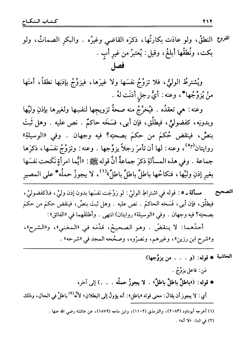 وَعَنْهُ: هِيَ، تَعْقِدُهُ فَيَخْرُجُ مِنْهُ صِحَّةُ تَزْوِيجِهَا لِنَفْسِهَا وَلِغَيْرِهَا بِإِذْنِ وَلِيِّهَا، وَبِدُونِهِ كَفُضُولِيٍّ، فَيُطَلِّقُ، فَإِنْ أَبَى، فَسَخَهُ حَاكِمٌ، نَصَّ عَلَيْهِ. وَهَلْ ثَبَتَ بِنَصٍّ فَيَنْقُضُ حُكْمَ مَنْ حَكَمَ بِصِحَّتِهِ؟ فِيهِ وَجْهَانِ. وَفِي الْوَسِيلَةِ رِوَايَتَانِ "م 5" وَعَنْهُ: لَهَا أَنْ تَأْمُرَ رَجُلًا يُزَوِّجُهَا. وَعَنْهُ: وَتُزَوِّجُ نَفْسَهَا، ذَكَرَهَا جَمَاعَةٌ، وَفِي هَذِهِ الْمَسْأَلَةِ ذَكَرَ جَمَاعَةٌ أَنَّ قَوْلَهُ صَلَّى اللَّهُ عَلَيْهِ وَسَلَّمَ "أَيُّمَا امْرَأَةٍ نَكَحَتْ نَفْسَهَا بِغَيْرِ إذْنِ وَلِيِّهَا فَنِكَاحُهَا بَاطِلٌ بَاطِلٌ باطل" 1 لا يجوز حمله على المصير