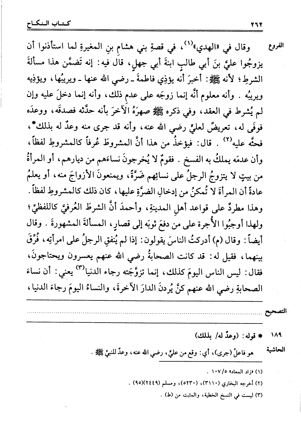 وَقَالَ فِي الْهَدْيِ1 فِي قِصَّةِ بَنِي هِشَامِ بْنِ الْمُغِيرَةِ لَمَّا اسْتَأْذَنُوا أَنْ يُزَوِّجُوا عَلِيَّ بْنَ أَبِي طَالِبٍ ابْنَةَ أَبِي جَهْلٍ قَالَ فِيهِ: إنَّهُ تَضَمَّنَ هَذَا مَسْأَلَةَ الشَّرْطِ؛ لِأَنَّهُ صَلَّى اللَّهُ عَلَيْهِ وَسَلَّمَ أَخْبَرَ أَنَّهُ يُؤْذِي فَاطِمَةَ رَضِيَ اللَّهُ عَنْهَا وَيَرِيبُهَا، وَيُؤْذِيهِ وَيَرِيبُهُ. وَأَنَّهُ مَعْلُومٌ أَنَّهُ [إنَّمَا] زَوَّجَهُ عَلَى عَدَمِ ذَلِكَ، وَأَنَّهُ إنَّمَا دَخَلَ عَلَيْهِ وَإِنْ لَمْ يَشْرِطْ فِي الْعَقْدِ، وَفِي ذِكْرِهِ صَلَّى اللَّهُ عَلَيْهِ وَسَلَّمَ صِهْرَهُ الْآخَرَ بِأَنَّهُ حَدَّثَهُ فَصَدَّقَهُ، وَوَعَدَهُ فَوَفَّى لَهُ، تَعْرِيضٌ لِعَلِيٍّ رَضِيَ اللَّهُ عَنْهُ وَأَنَّهُ قَدْ جَرَى مِنْهُ وَعْدٌ لَهُ بِذَلِكَ، فَحَثَّهُ عَلَيْهِ2، قَالَ فَيُؤْخَذُ مِنْ هَذَا أَنَّ الْمَشْرُوطَ عُرْفًا كَالْمَشْرُوطِ لَفْظًا، وَإِنْ عَدِمَهُ يَمْلِكُ بِهِ الْفَسْخَ، فَقَوْمٌ لَا يُخْرِجُونَ نِسَاءَهُمْ مِنْ دِيَارِهِمْ أَوْ الْمَرْأَةَ مِنْ بَيْتٍ لَا يُزَوَّجُ الرَّجُلُ عَلَى نِسَائِهِمْ ضَرَّةً، وَيَمْنَعُونَ الْأَزْوَاجَ مِنْهُ، أَوْ يُعْلَمُ عَادَةً أَنَّ الْمَرْأَةَ لَا تُمَكِّنُ مِنْ إدْخَالِ الضَّرَّةِ عَلَيْهَا، كَانَ ذَلِكَ كَالْمَشْرُوطِ لَفْظًا، وَهَذَا مُطَّرِدٌ عَلَى قَوَاعِدِ أَهْلِ الْمَدِينَةِ وَأَحْمَدَ أَنَّ الشَّرْطَ الْعُرْفِيَّ كَاللَّفْظِيِّ، وَلِهَذَا أَوْجَبُوا الْأُجْرَةَ عَلَى مَنْ دَفَعَ ثَوْبَهُ إلَى قَصَّارٍ، الْمَسْأَلَةَ الْمَشْهُورَةَ. وَقَالَ أَيْضًا: وَقَالَ "م"، أَدْرَكْتُ النَّاسَ يَقُولُونَ: إذَا لَمْ يُنْفِقْ الرَّجُلُ عَلَى امْرَأَتِهِ فُرِّقَ بَيْنَهُمَا، فَقِيلَ لَهُ: قَدْ كَانَتْ الصَّحَابَةُ رَضِيَ اللَّهُ عَنْهُمْ يُعْسِرُونَ وَيَحْتَاجُونَ، فَقَالَ: لَيْسَ النَّاسُ الْيَوْمَ كَذَلِكَ. إنَّمَا تَزَوَّجَتْهُ رَجَاءَ الدُّنْيَا3 يَعْنِي أَنَّ نِسَاءَ الصَّحَابَةِ رَضِيَ اللَّهُ عَنْهُمْ كُنَّ يُرِدْنَ الدَّارَ الْآخِرَةَ، وَالنِّسَاءُ اليوم رجاء الدنيا،