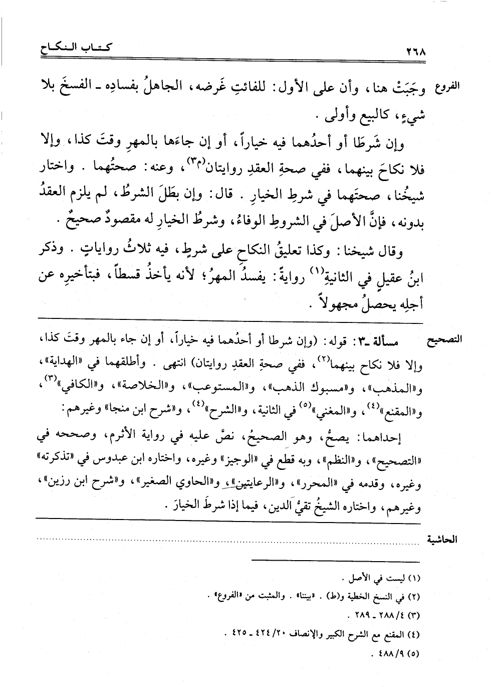 ـــــــــــــــــــــــــــــQمَسْأَلَةٌ – 3: قَوْلُهُ: "وَإِنْ شَرَطَا أَوْ أَحَدُهُمَا فِيهِ خِيَارًا، أَوْ إنْ جَاءَ بِالْمَهْرِ وَقْتَ كَذَا وَإِلَّا فَلَا نِكَاحَ بَيْنَهُمَا2، فَفِي صِحَّةِ الْعَقْدِ رِوَايَتَانِ". انْتَهَى. وَأَطْلَقَهُمَا فِي الْهِدَايَةِ وَالْمُذَهَّبِ وَمَسْبُوكِ الذَّهَبِ وَالْمُسْتَوْعِبِ وَالْخُلَاصَةِ وَالْكَافِي3 وَالْمُقْنِعِ4، وَالْمُغْنِي5 فِي الثَّانِيَة، وَالشَّرْحِ4 وَشَرْحِ ابْنِ مُنَجَّى وَغَيْرِهِمْ: