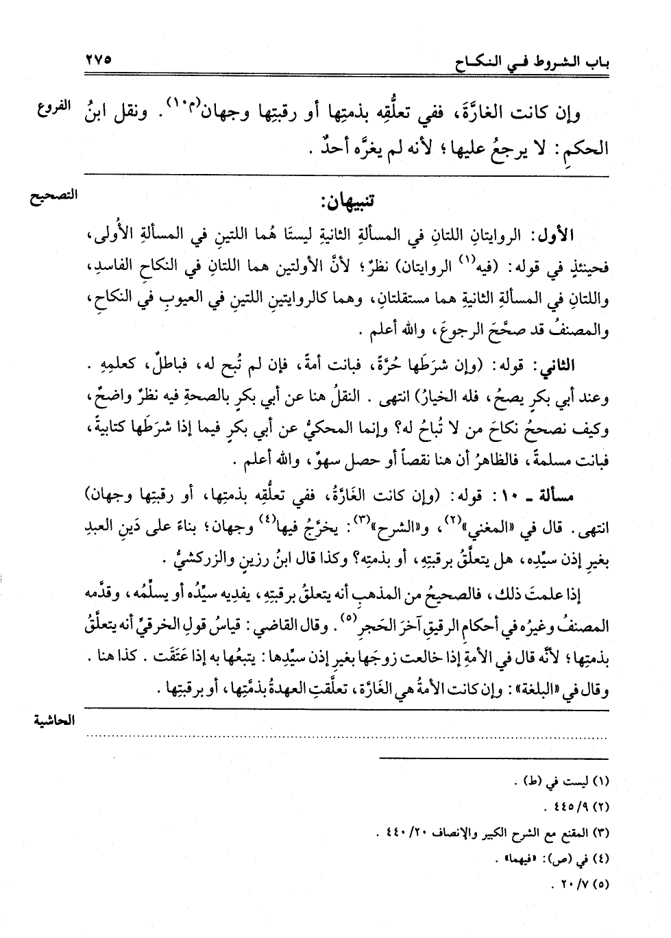 الثَّانِي: قَوْلُهُ: "وَإِنْ شَرَطَهَا حُرَّةً فَبَانَتْ أَمَةً فَإِنْ لَمْ تُبَحْ لَهُ فَبَاطِلٌ كَعِلْمِهِ، وَعِنْدَ أَبِي بَكْرٍ يَصِحُّ فَلَهُ الْخِيَارُ". انْتَهَى. النَّقْلُ هُنَا عَنْ أَبِي بَكْرٍ بِالصِّحَّةِ فِيهِ نَظَرٌ وَاضِحٌ، وَكَيْفَ يَصِحُّ نِكَاحُ مَنْ لَا تُبَاحُ لَهُ؟ وَإِنَّمَا الْمَحْكِيُّ عَنْ أَبِي بَكْرٍ فِيمَا إذَا شَرَطَهَا كِتَابِيَّةً فَبَانَتْ مُسْلِمَةً، فَالظَّاهِرُ أَنَّ هُنَا نَقْصًا أَوْ حَصَلَ سَهْوٌ، وَاَللَّهُ أَعْلَمُ.
